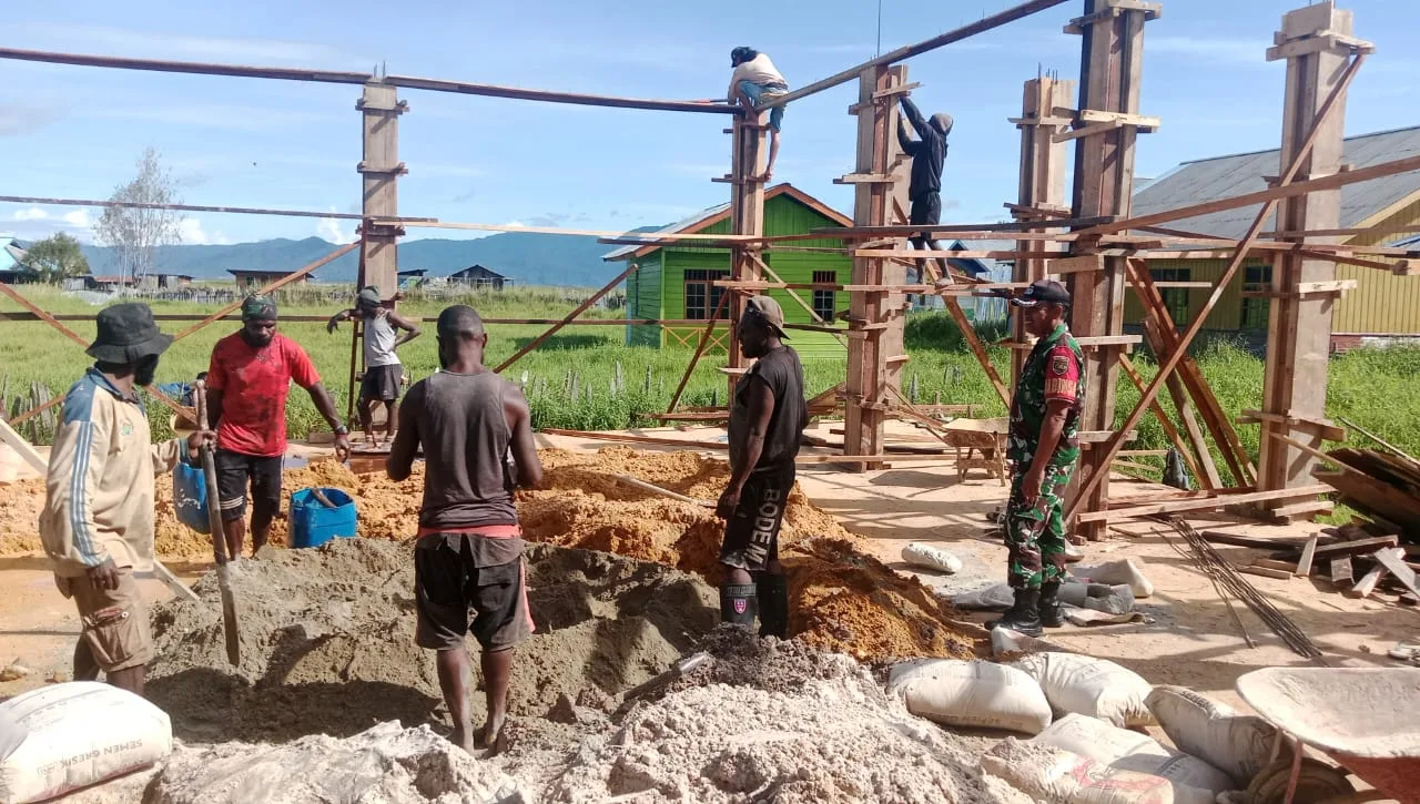 Enarotali – Dalam rangka menjaga situasi tetap aman dan menjalin kedekatan dengan masyarakat, Babinsa Koramil 1703-01/Enarotali melaksanakan kegiatan monitoring wilayah binaan serta komunikasi sosial (Komsos) bersama para pekerja bangunan di salah satu titik pembangunan di wilayah Kampung Awabutu, Distrik Paniai Timur, Kabupaten Paniai, Senin (29/12/2015).