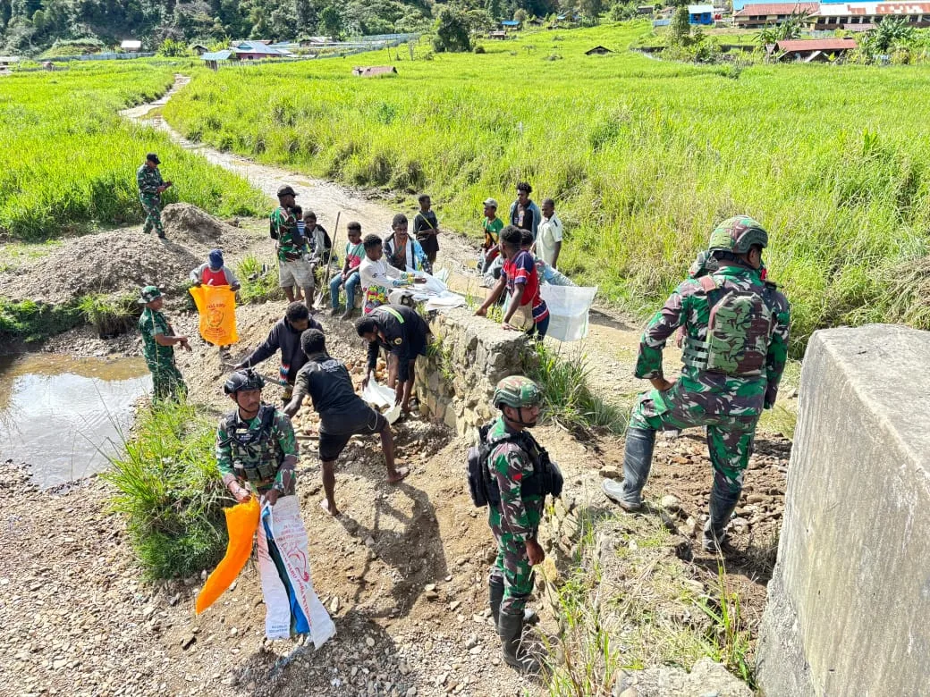 Obano – Di pimpin Danramil 1703-03/Obano kapten Inf Soleman Demotokay, bersama anggota babinsa beserta 10 orang anggota Satgas Pamtas Yonif 711/Rks dan warga bergotong royong melaksanakan penimbunan Jalan Kampung Obano, Distrik Paniai Barat, Kabupaten Paniai, Prov. Papua Tengah. Selasa,(09/12/2025).