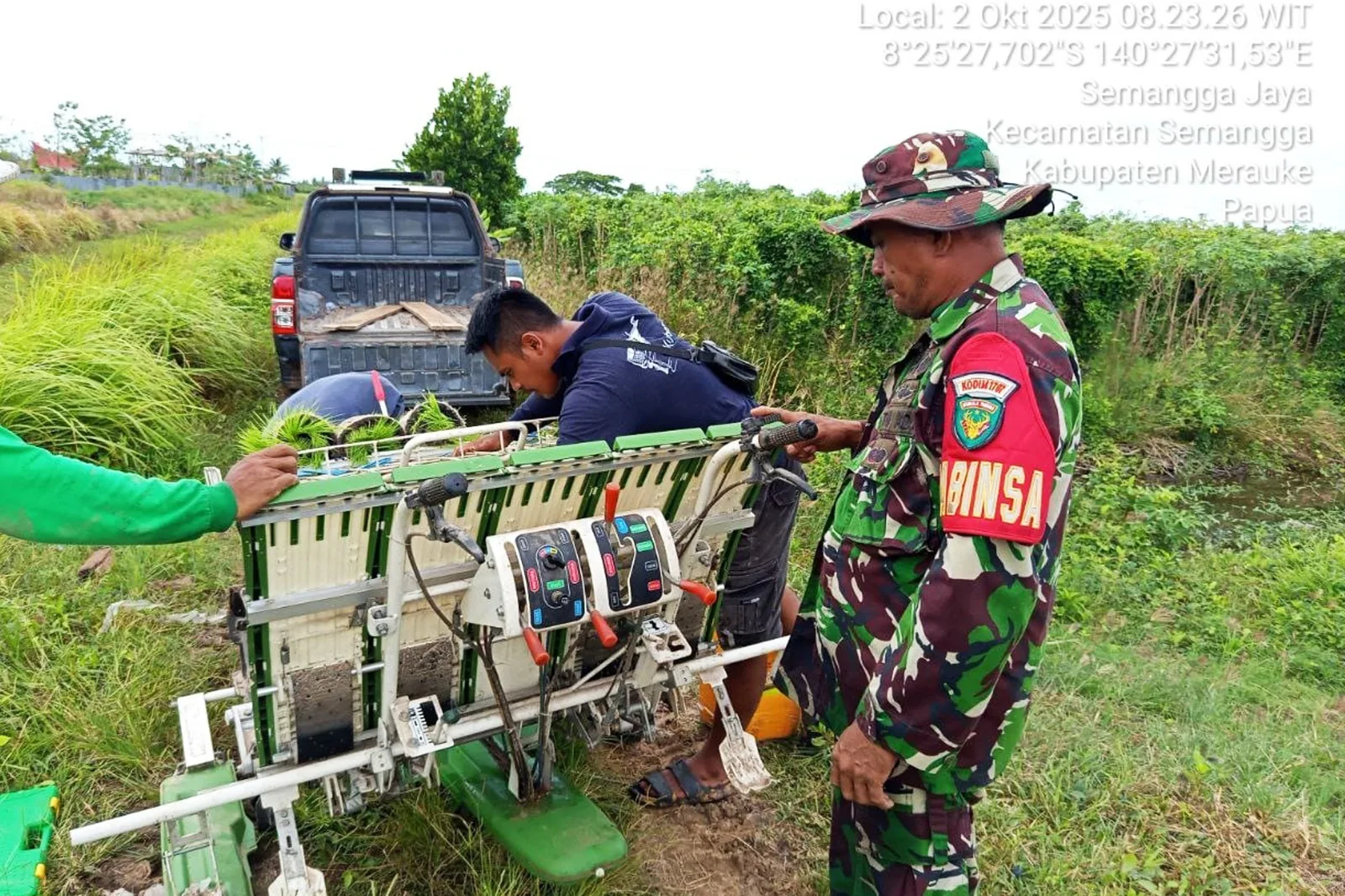 Merauke, 2 Oktober 2025 – Babinsa Koramil 1707-02/Merauke Kodim 1707/Merauke, Serka Ahmad Daeng, melaksanakan pendampingan sekaligus membantu Bapak Agus, salah satu petani Kampung Marga Mulya, Distrik Semangga, Kabupaten Merauke, dalam kegiatan penanaman bibit padi di lahan sawah miliknya seluas 1 hektar.