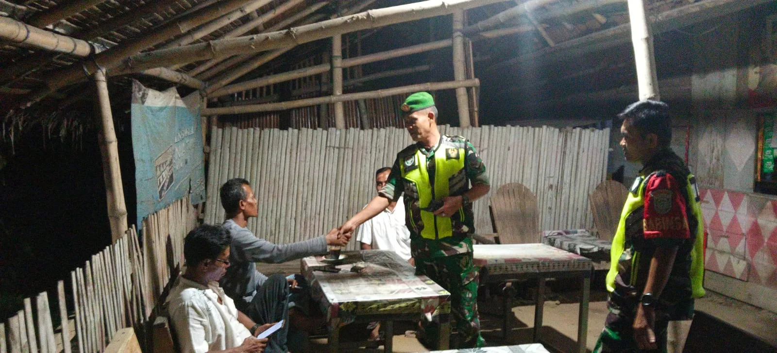 Selain melakukan pemantauan wilayah, Babinsa juga berinteraksi langsung dengan warga yang sedang melaksanakan ronda malam.