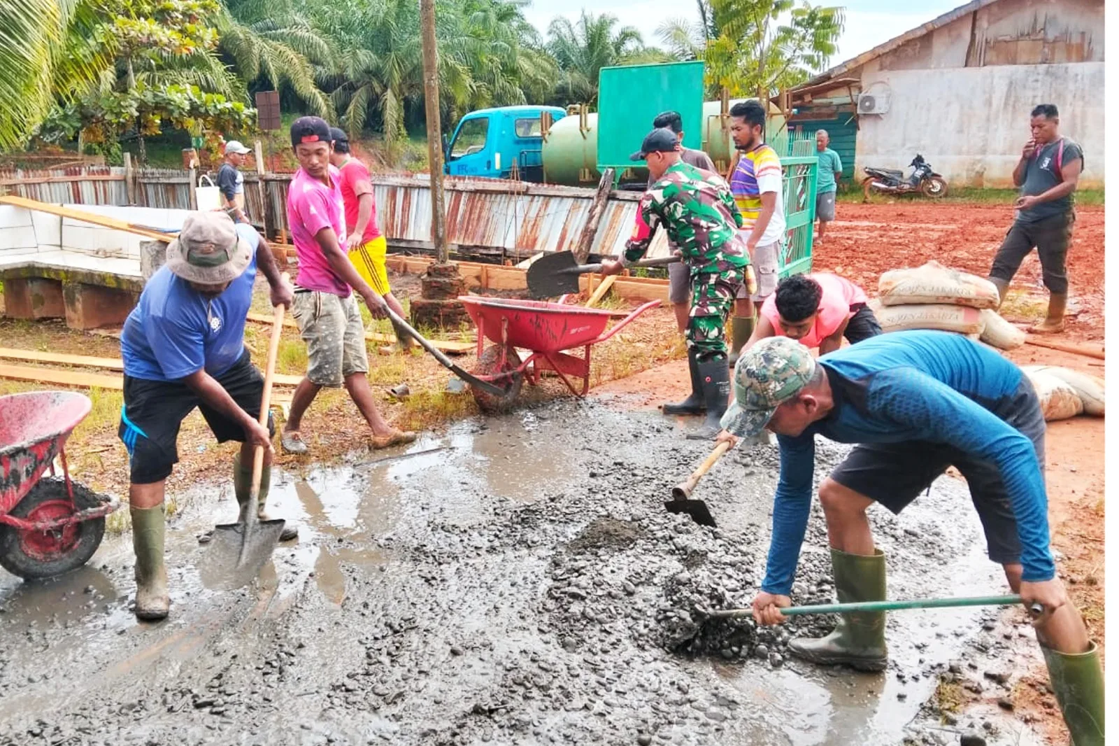 Kegiatan yang dimulai pukul 08.00 WIT tersebut berlangsung penuh keakraban. Babinsa dan warga bahu-membahu mengangkat material, mengaduk semen, serta mengecor pondasi pagar masjid sebagai bagian dari pembangunan sarana ibadah yang menjadi pusat kegiatan keagamaan masyarakat Kampung Selil.