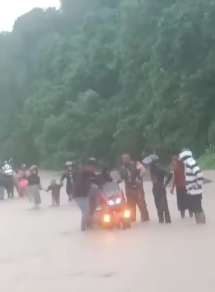 Babinsa membantu masyarakat menyebrangi sungai yg banjir