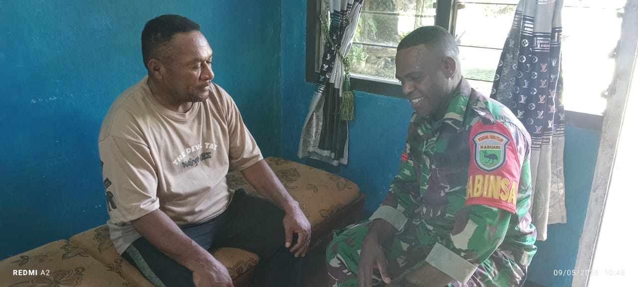 Babinsa Koramil 1811/01 Wasior, Pratu Riski Nadap Nunaki, menunjukkan komitmen kuat dalam memperkuat sinergitas antara TNI dan masyarakat dengan melaksanakan anjangsana di Kampung Tandia, Distrik Rasiei, Kabupaten Teluk Wondama, pada 9 Mei 2025.