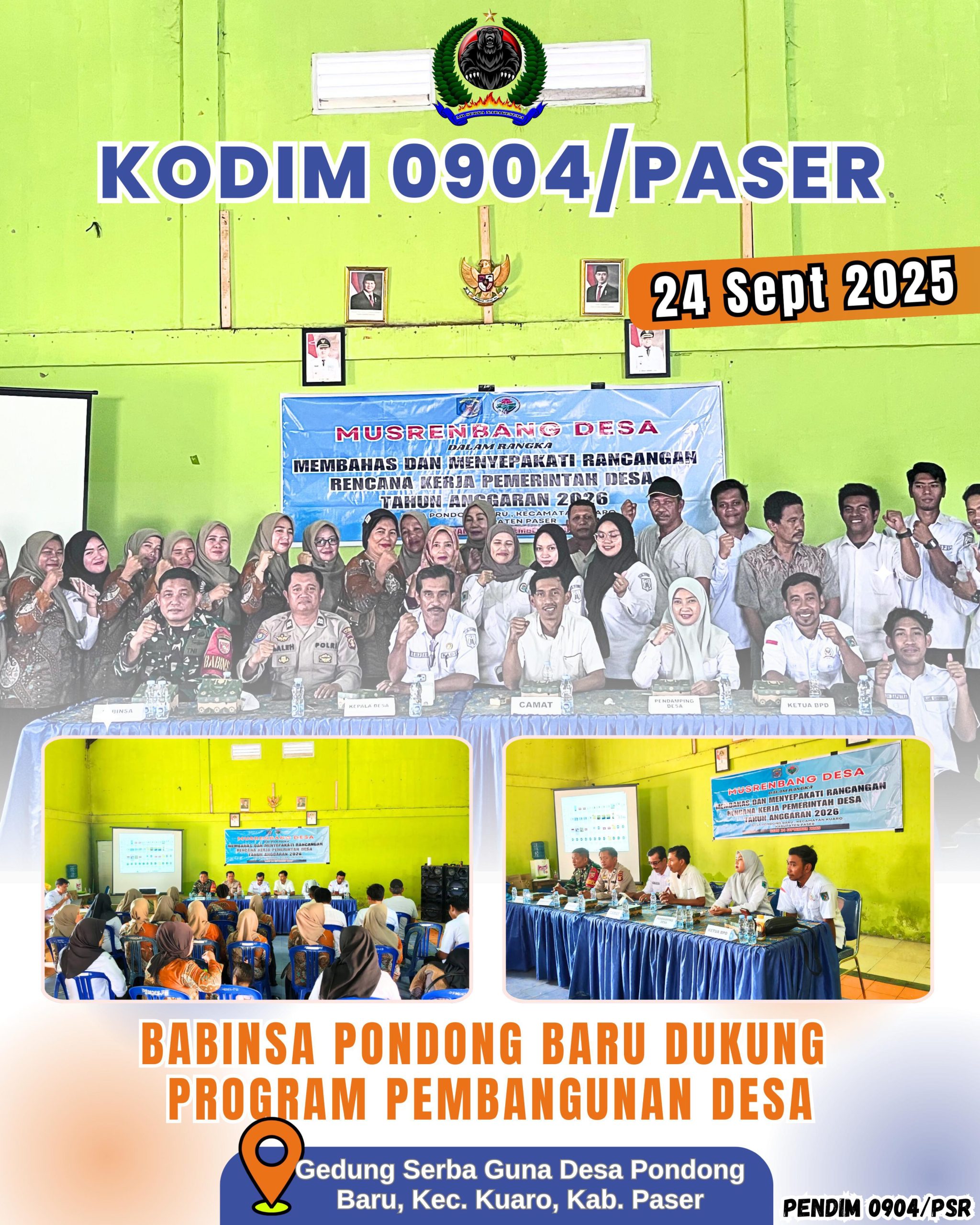 Kodim 0904/Psr, Korem 091/ASN, Kodam VI/Mlw – Babinsa Pondong Baru Serda Darwit Jaya hadir dalam Musyawarah Desa (MUSDES) dan Penyusunan RKP Desa Tahun 2026 yang bertempat di Gedung Serba Guna Desa Pondong Baru, Kec. Kuaro, Kab. Paser, Rabu(24/9/2025).