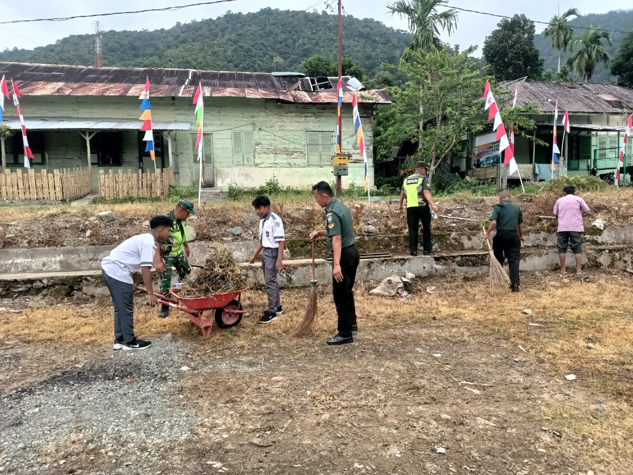 Pidie – Menyambut peringatan Hari Kemerdekaan Republik Indonesia yang ke-80, Babinsa Koramil 16/Tangse Kodim 0102/Pidie, Serka Purnama, menggandeng masyarakat dan pelajar untuk melaksanakan gotong royong membersihkan area lapangan upacara di Desa Keude Tangse, Kecamatan Tangse, Kabupaten Pidie, Rabu (13/8/2025).
