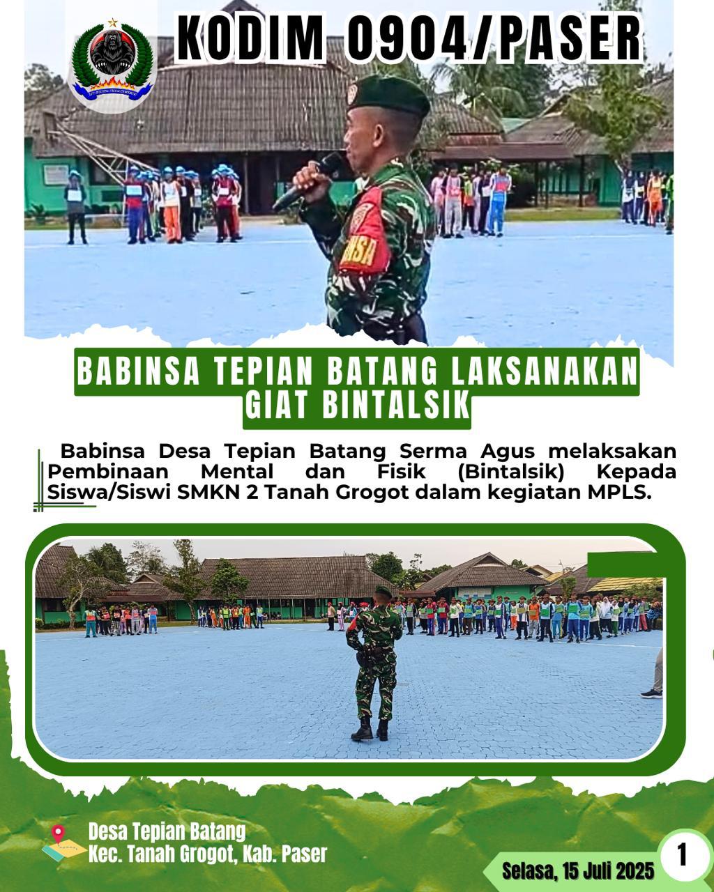 Kodim 0904/Psr, Korem 091/ASN, Kodam VI/Mlw – Bertempat di SMKN 2 Tanah Grogot Jln Sangkuriman Desa Tepian Batang Kec,Tanah Grogot Kab.Paser Babinsa Desa Tepian Batang Serma Agus melaksakan Pembinaan Mental dan Fisik (Bintalsik) Kepada Siswa/Siswi SMKN 2 Tanah Grogot dalam kegiatan MPLS.