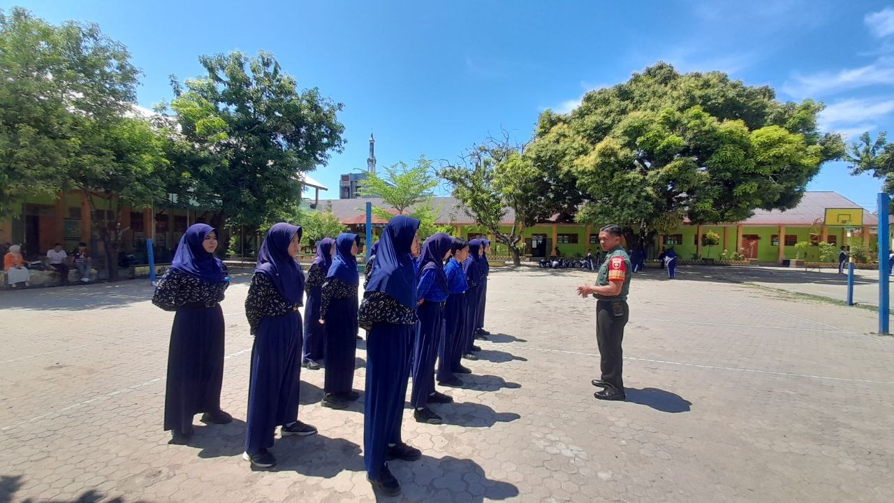 KODIM 1405/PAREPARE – Selain Tugas Pembinaan Desa, Anggota Koramil 1405-01/Ujung Serda Muhammad Ali, juga melaksanakan kegiatan Pembinaan Ketahanan wilayah (Bintahwil) dengan cara memberikan Pelajaran Peraturan Baris Berbaris (PBB), pada Siswa/Siswi UPTD SMP Negeri 1 Parepare, Jl. Karaeng Burane Kelurahan Mallusetasi, Kecamatan Ujung, Kota Parepare. Rabu (04/06/2025)