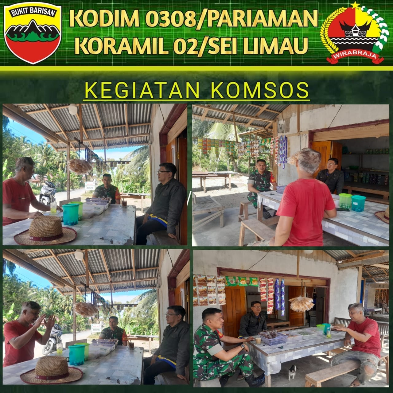 SUNGAI LIMAU, – Babinsa Sertu M.Syofyan anggota Koramil 02/Sungai Limau Kodim 0308/Pariaman, Melaksanakan kegiatan Komunikasi Sosial (Komsos) Bersama Warga Binaan,disalah warung yang terletak dikorong padang olo Nagari Kuranji Hilir, Kecamatan Sungai limau, Kabupaten Padang Pariaman, Jum’at (06/06/2025).