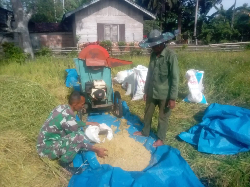 Usai mengarit padi bersama dengan warga di desa binaannya, Serda Megi Juanda juga turut bantu petani lakukan perontokan padi dengan menggunakan mesin perontok padi di sawah milik warga desa binaan.