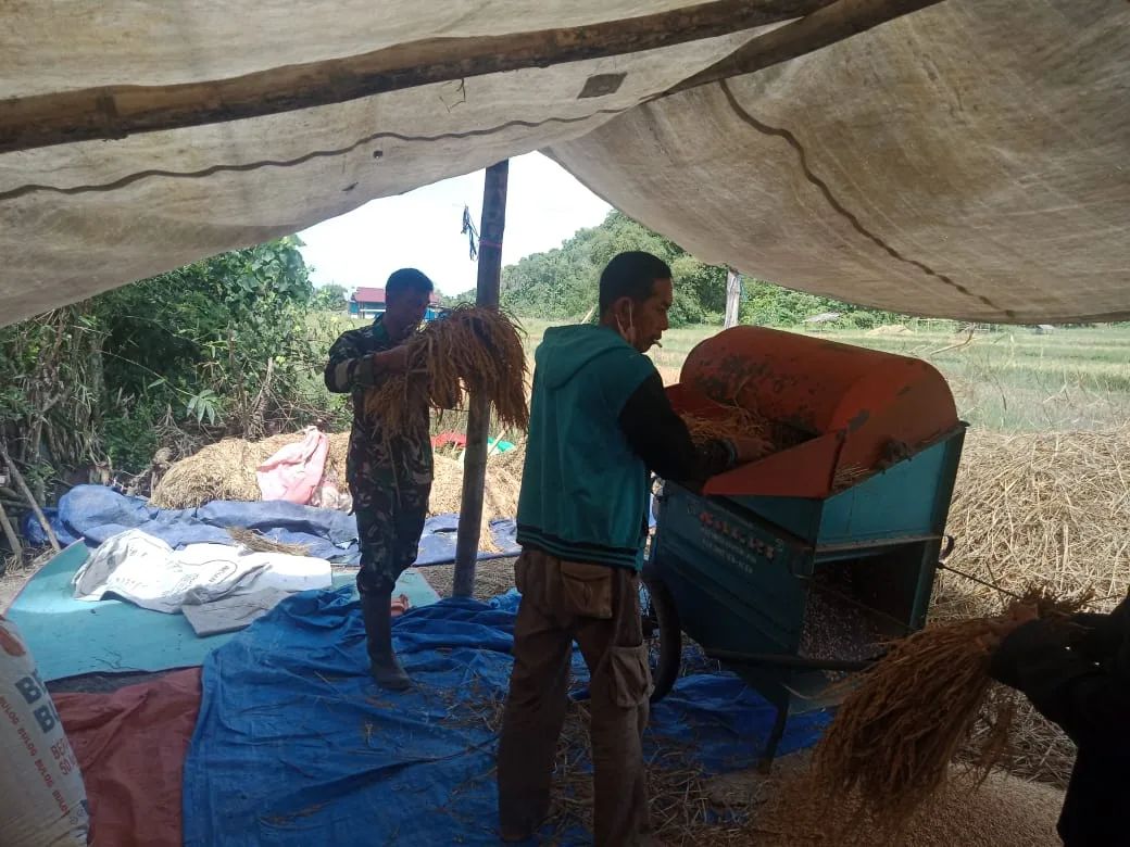 Usai mengarit padi bersama dengan warga di desa binaannya, Babinsa juga turut bantu petani lakukan perontokan padi dengan menggunakan mesin perontok padi di sawah milik warga desa binaan.