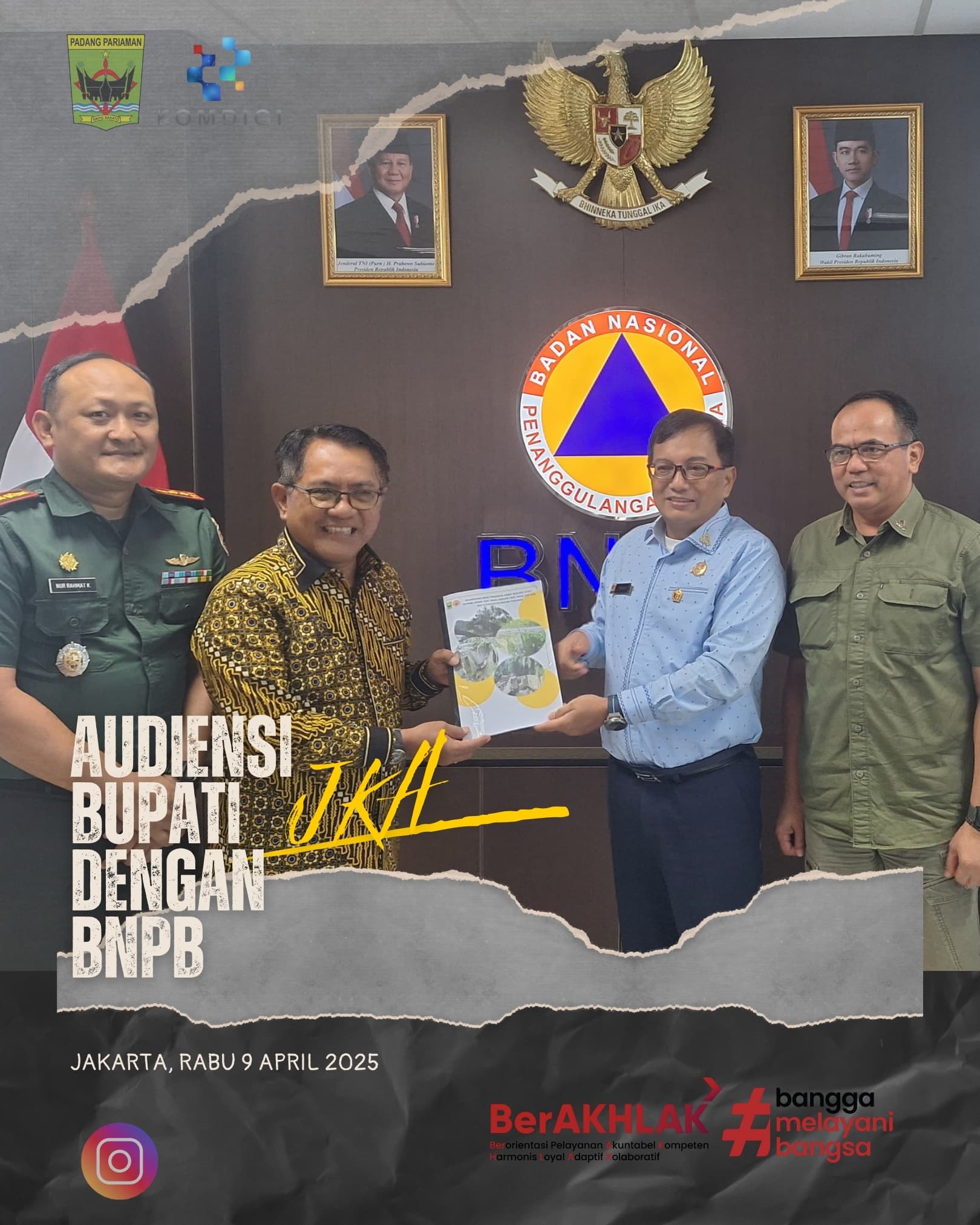 JAKARTA, — Bupati Padang Pariaman, John Kenedy Azis (JKA), melakukan audiensi dengan Badan Nasional Penanggulangan Bencana (BNPB), pada Rabu, (09/04/2025) di Gedung Graha BNPB.