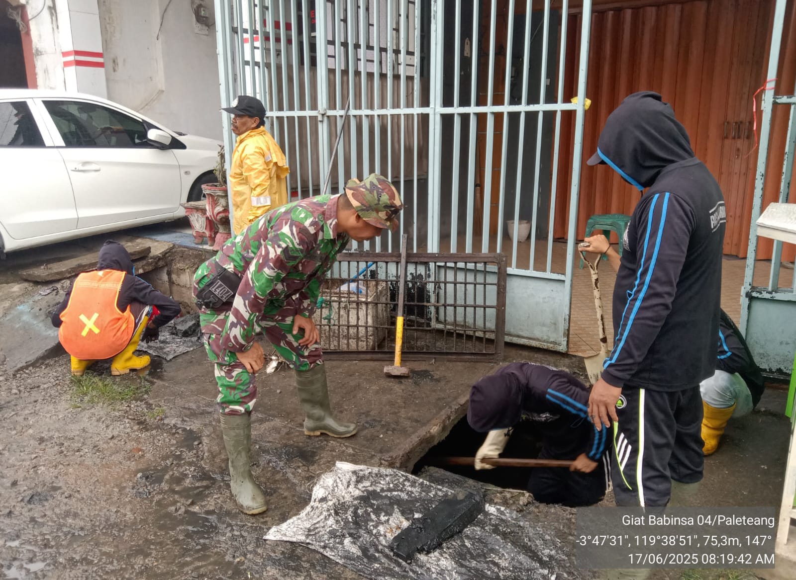Pinrang_ Sebagai wujud kepedulian terhadap kebersihan Lingkungan, Koramil-04/Paleteang Kodim 1404/Pinrang menggandeng berbagai pihak dan masyarakat melaksanakan kerja bakti membersihkan saluran air yang tersumbat sampah-sampah dan pasir di Kelurahan Pacongan Kecamatan Watang Sawitto Kabupaten Pinrang, Rabu (18/06/2025).