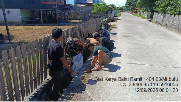 Pinrang_ Untuk mengantisipasi banjir ketika hujan turun serta menjaga kebersihan Lingkungan, Babinsa jajaran Koramil-03/Mattiro Bulu Kodim 1404/Pinrang bersama warga melaksanakan kerja bakti pembersihan parit/saluran air di Dusun Benteng Desa Marannu Kecamatan Mattiro Bulu Kabupaten Pinrang, Jum’at (12/09/2025).