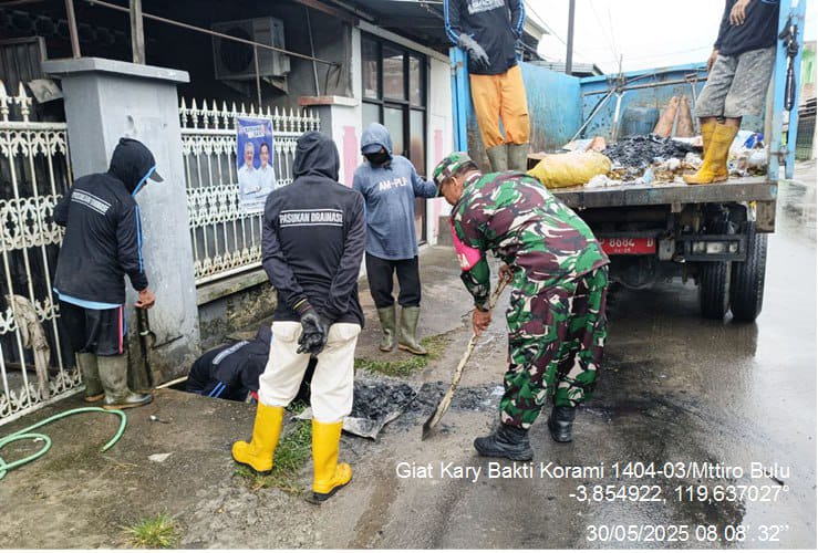 Pinrang_ Untuk mengantisipasi banjir ketika hujan turun serta menjaga kebersihan Lingkungan, Babinsa jajaran Koramil-03/Mattiro Bulu Kodim 1404/Pinrang bersama warga melaksanakan kerja bakti pembersihan parit/saluran air di Lingkungan Bulu Kelurahan Manarang Kecamatan Mattiro Bulu Kabupaten Pinrang, Sabtu (15/02/2025).