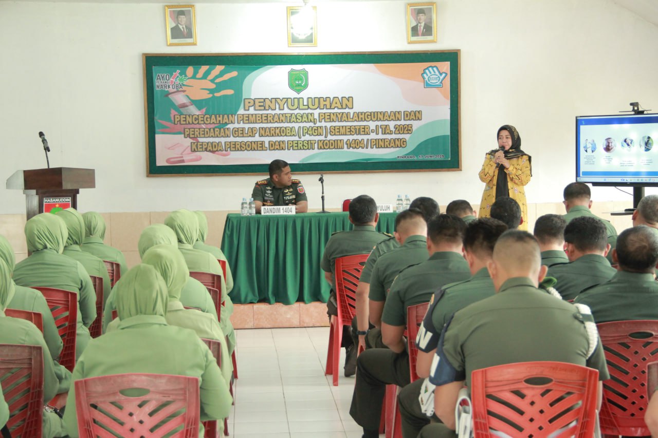 Pinrang_ Kodim 1404/Pinrang menggelar penyuluhan pencegahan, pemberantasan, penyalahgunaan dan peredaran gelap narkoba (P4GN) Semester I Tahun 2025 di Pendopo Makodim 1404/Pinrang, Kamis (26/06/2026).
