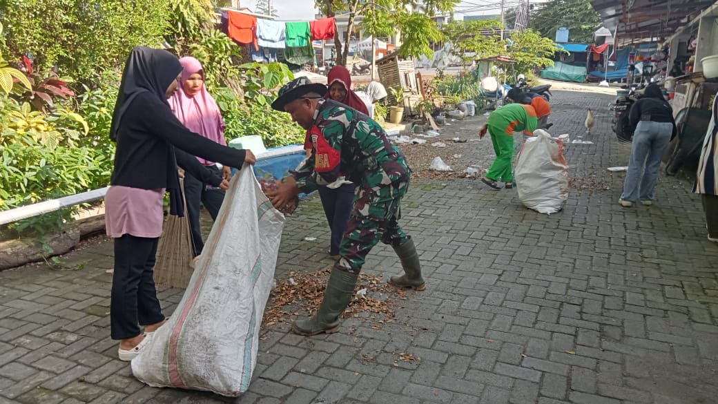 Enrekang – personil koramil 1419-02/Enrekang Melaksanakan karya bakti pembersihan pasar sentral jupandang dari tanah, rumput dan sampah lainnya sepanjang 400 meter di Lingk. Bungawalie Kel. Juppandang Kec. Enrekang Kab. Enrekang. Rabu,(16/06/2025).