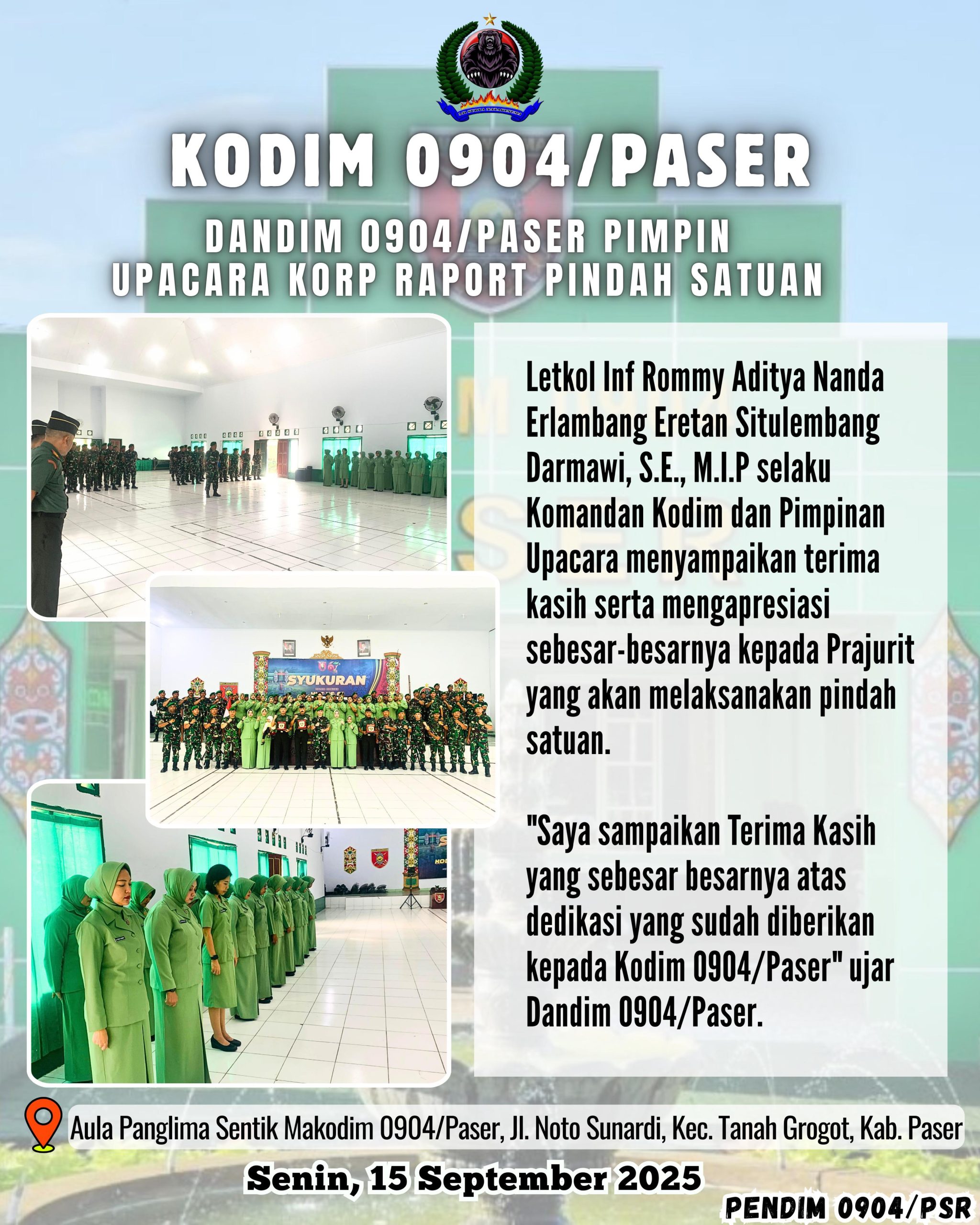 Kodim 0904/Paser Korem 091/ASN Kodam VI/Mlw, Kecamatan Tanah Grogot. Bertempat di Aula Panglima Sentik Makodim 0904/Paser telah dilaksanakan Upacara Korp Raport Pindah Satuan bagi Prajurit Kodim 0904/Paser yang akan berdinas di Satuan Barunya. Senin (15/8/2025)