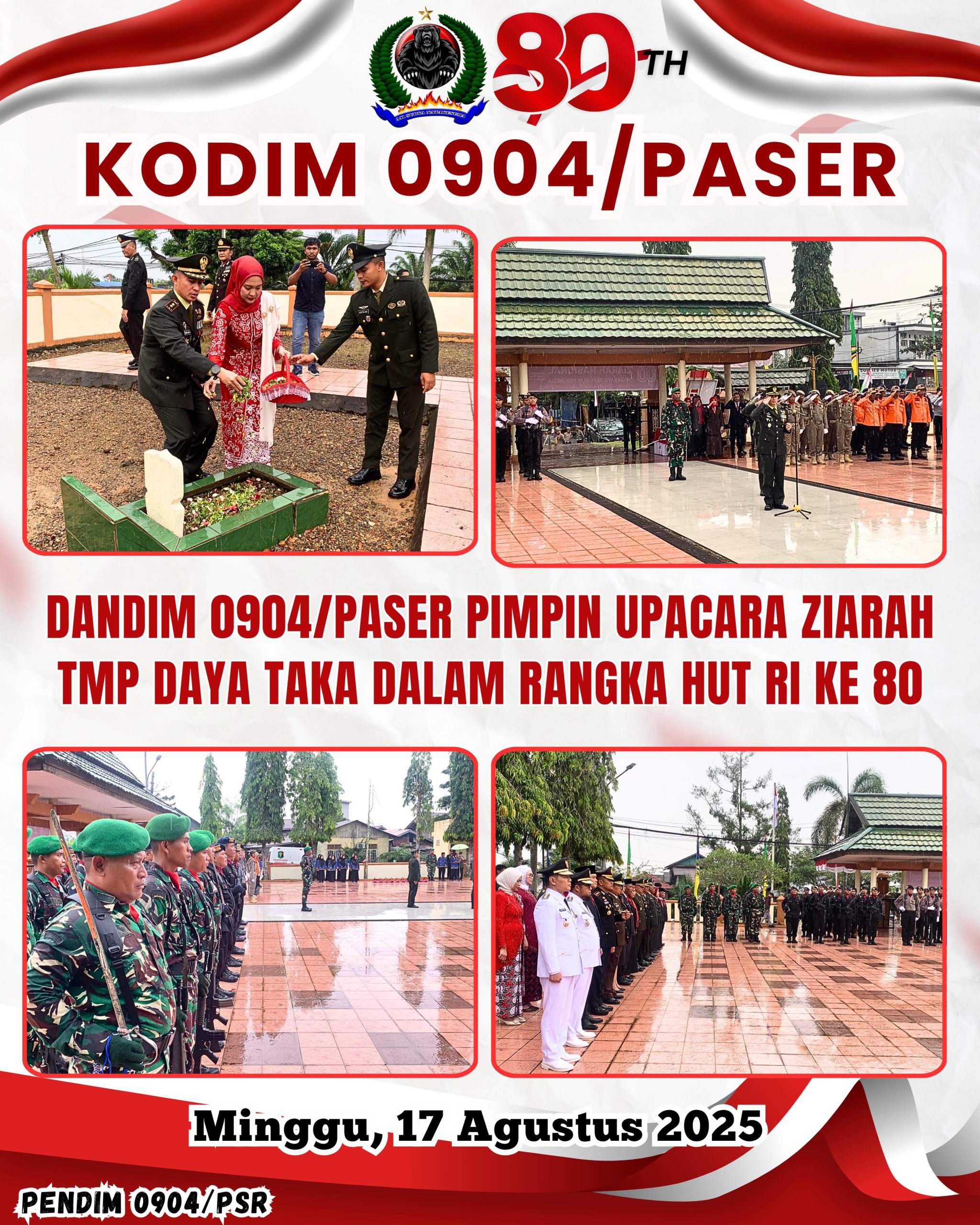Kodim 0904/Paser Korem 091/ASN Kodam VI/Mlw, Kecamatan Tanah Grogot. Ziarah TMP Daya Taka merupakan salah satu rangkaian kegiatan dalam memperingati Hari Ulang Tahun Republik Indonesia yang ke 80 tahun 2025, Irup dalam kegiatan ini dipimpin oleh Dandim 0904/Paser Letkol Inf Rommy Aditya Nanda Erlambang Eretan Situlembang Darmawi, S.E., M.I.P. Minggu (17/8/2025)