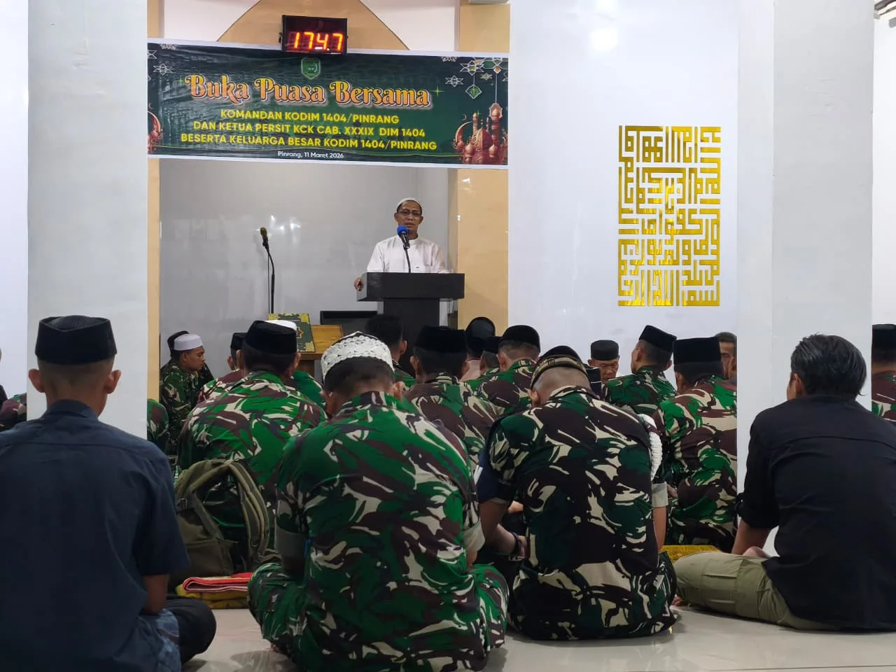 Pinrang_ Dalam rangka mempererat tali silaturahmi di bulan suci Ramadhan 1447 H, Dandim 1404/Pinrang Letkol Czi Imam Subekti, S.E., M.Sc., bersama Ketua Persit Kartika Chandra Kirana (KCK) Cabang XXXIX Kodim 1404 Ny. Fitriana Imam Subekti melaksanakan kegiatan buka puasa bersama keluarga besar Kodim 1404/Pinrang, Rabu (11/03/2026).