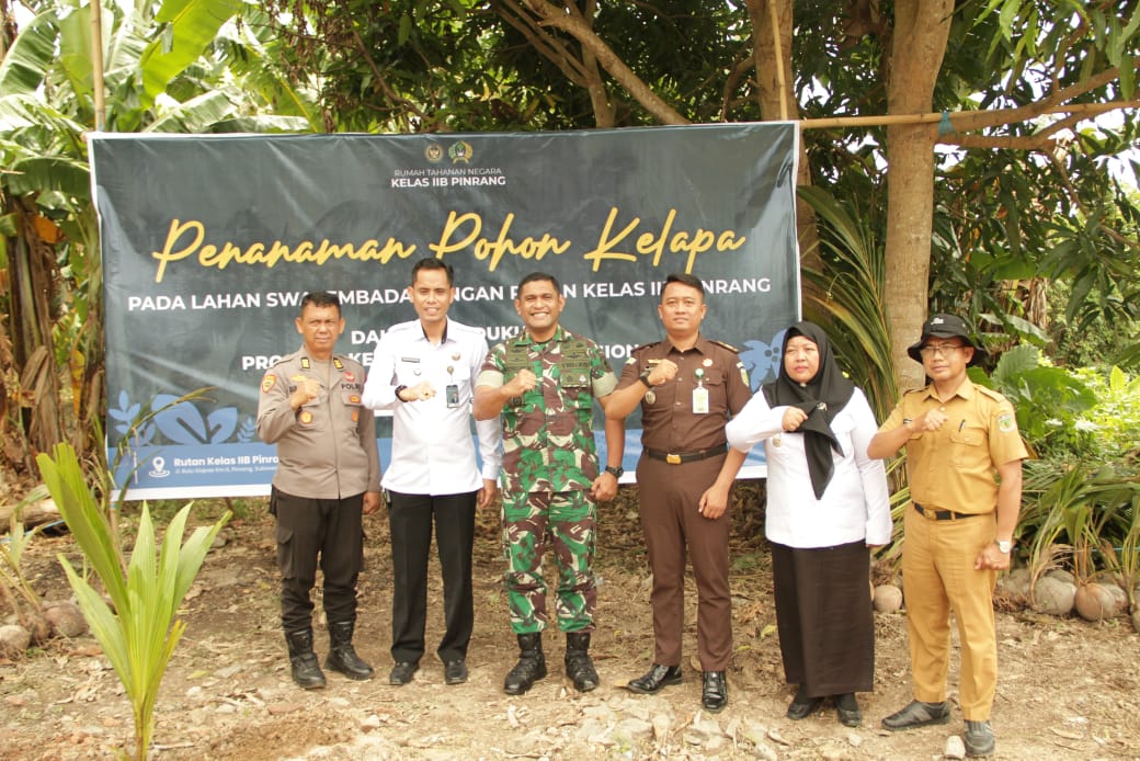 Pinrang_ Dandim 1404/Pinrang Letkol Inf Abdullah Mahua, S.H.I., M.M., bersama Forkopimda melaksanakan penanaman pohon kelapa di Rutan kelas IIB Kelurahan Manarang Kecamatan Mattiro Bulu Kabupaten Pinrang, Rabu (10/09/2025).