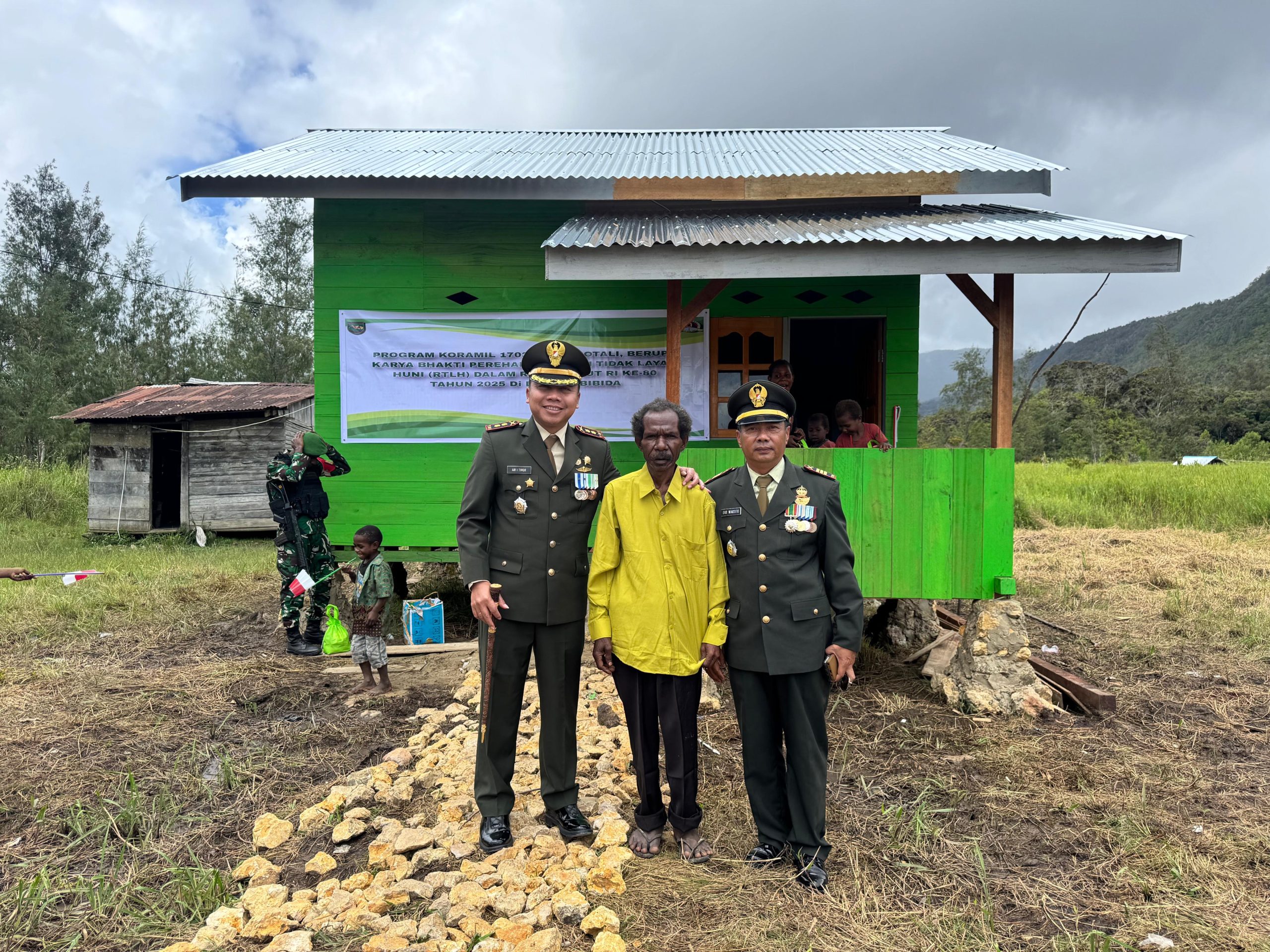 Bibida – Komandan Kodim 1703/Deiyai, Letkol Inf Ari Iswoyo Timor, S.Hub.Int memimpin acara penyerahan kunci Rumah secara simbolis hasil program Karya Bhakti Koramil 1703-01/Enarotali Berupa Bedah Rumah Tidak Layak Huni (RTLH) Milik Bapak Kris Zonggonau (Kepala Suku Distrik Bibida) Dalam rangka HUT RI Yang Ke-80 Tahun 2025, bertempat di Kampung Bibida, Jln. Pugapa, Distrik Bibida Kabupaten Paniai. Minggu (17/08/2025).