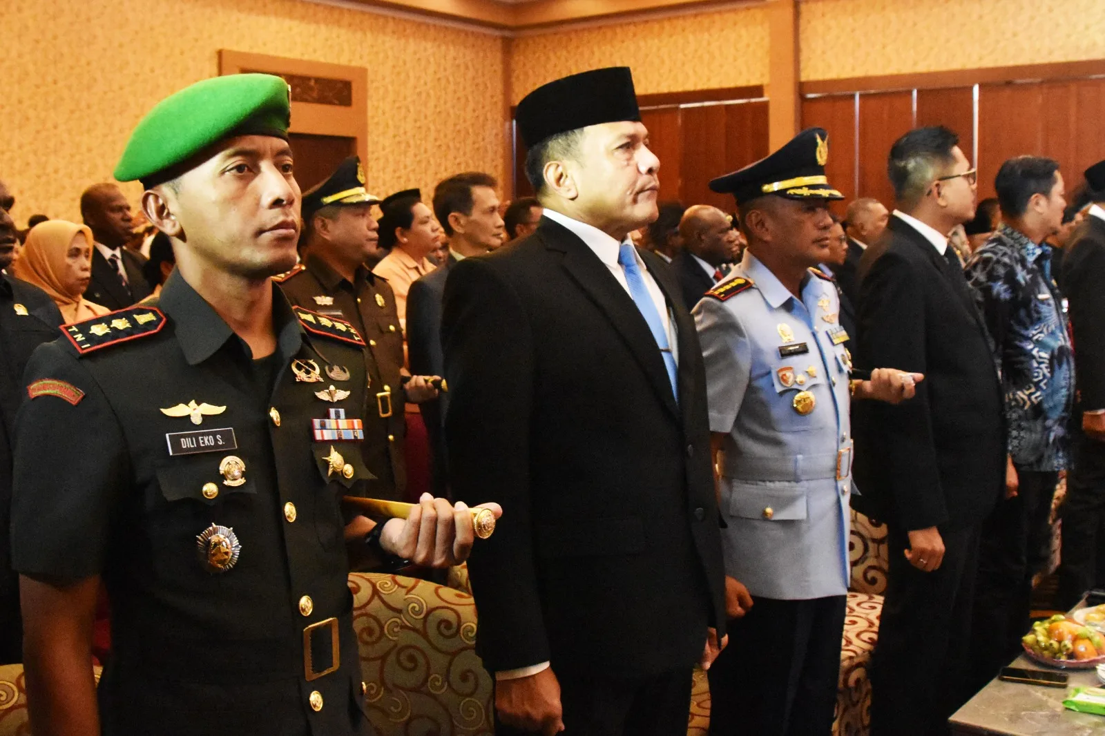 Komandan Kodim 1707/Merauke Letkol Czi Dili Eko Setyawan, S.Ak., M.Han., didampingi Ketua Persit KCK Cabang XVIII Kodim 1707/Merauke Ny. Asti Dili Eko Setyawan menghadiri Acara Pelantikan, Pengambilan Sumpah/Janji, dan Serah Terima Jabatan Pimpinan Tinggi Madya Sekretaris Daerah Provinsi Papua Selatan, yang dipimpin langsung oleh Gubernur Provinsi Papua Selatan Prof. Dr. Ir. Apolo Safanpo, ST., MT.