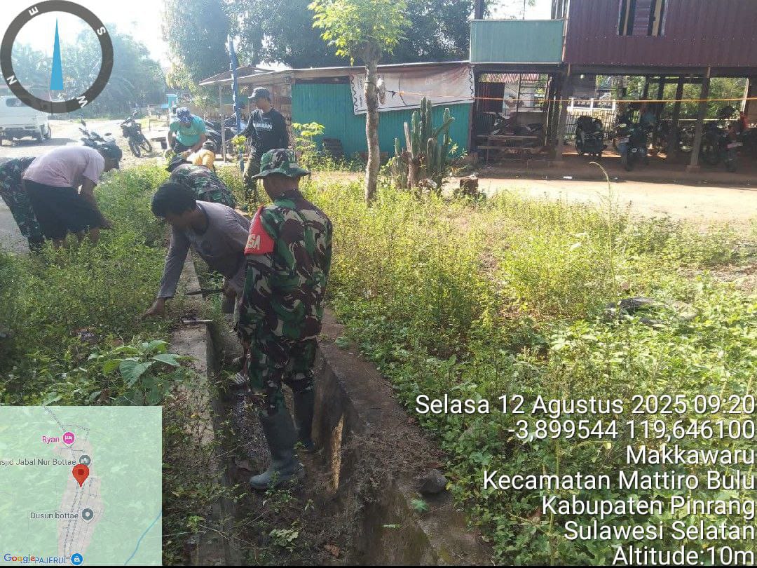 Pinrang_ Kegiatan pembersihan saluran air dalam rangka antisipasi banjir saat hujan dan timbulnya wabah penyakit semakin diintensifkan. Kali ini Danramil-03/Mattiro Bulu Kodim 1404/Pinrang Kapten Cba Najamuddin memimpin langsung kerja bakti bersama masyarakat dengan sasaran pembersihan saluran air di Dusun Bottae Desa Makkawaru Kecamatan Mattiro Bulu Kabupaten Pinrang, Kamis (14/08/2025).