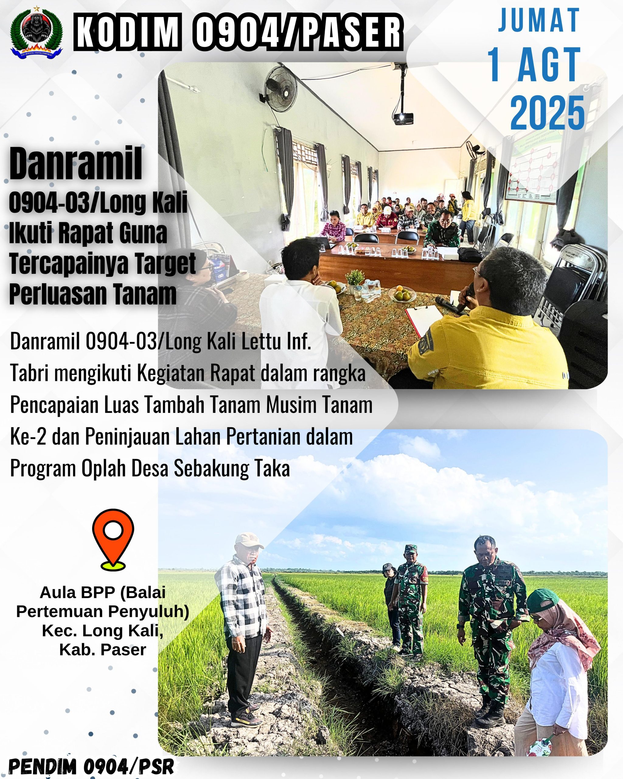 Kodim 0904/Psr, Korem 091/ASN, Kodam VI/Mlw – Bertempat di Aula BPP (Balai Pertemuan Penyuluh) Kec. Long Kali telah dilaksanakan Kegiatan Rapat dalam rangka Pencapaian Luas Tambah Tanam Musim Tanam Ke-2 dan Peninjauan Lahan Pertanian dalam Program Oplah Desa Sebakung Taka, Jumat (1/8/2025).