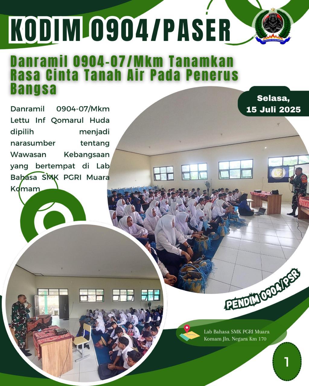 Kodim 0904/Psr, Korem 091/ASN, Kodam VI/Mlw – Pada Kegiatan Masa Pengenalan Lingkungan Sekolah SMK PGRI Muara Komam, Danramil 0904-07/Mkm Lettu Inf Qomarul Huda dipilih menjadi narasumber tentang Wawasan Kebangsaan yang bertempat di Lab Bahasa SMK PGRI Muara Komam, Jln Negara Km. 170, Kel. Muara Komam, Kec. Muara Komam, Selasa (15/7/2025).