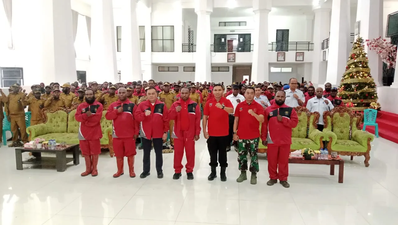 Paniai – Danramil 1703-01/Enarotali, Kapten Inf Eko Warsito, menghadiri kegiatan Pelantikan Satuan Tugas (SATGAS) Pembersihan Kampung dan Penanaman Pohon yang dilaksanakan di Aula Kantor Bupati Kabupaten Paniai, Jln. Raya Madi, Kampung Madi, Distrik Paniai Timur, Kabupaten Paniai, Provinsi Papua Tengah, kegiatan tersebut di Pimpin langsung Oleh Yampit Nawipa A.Md.Tek (Bupati Kabupaten Paniai) dan di Hadiri sekitar 150 Orang.