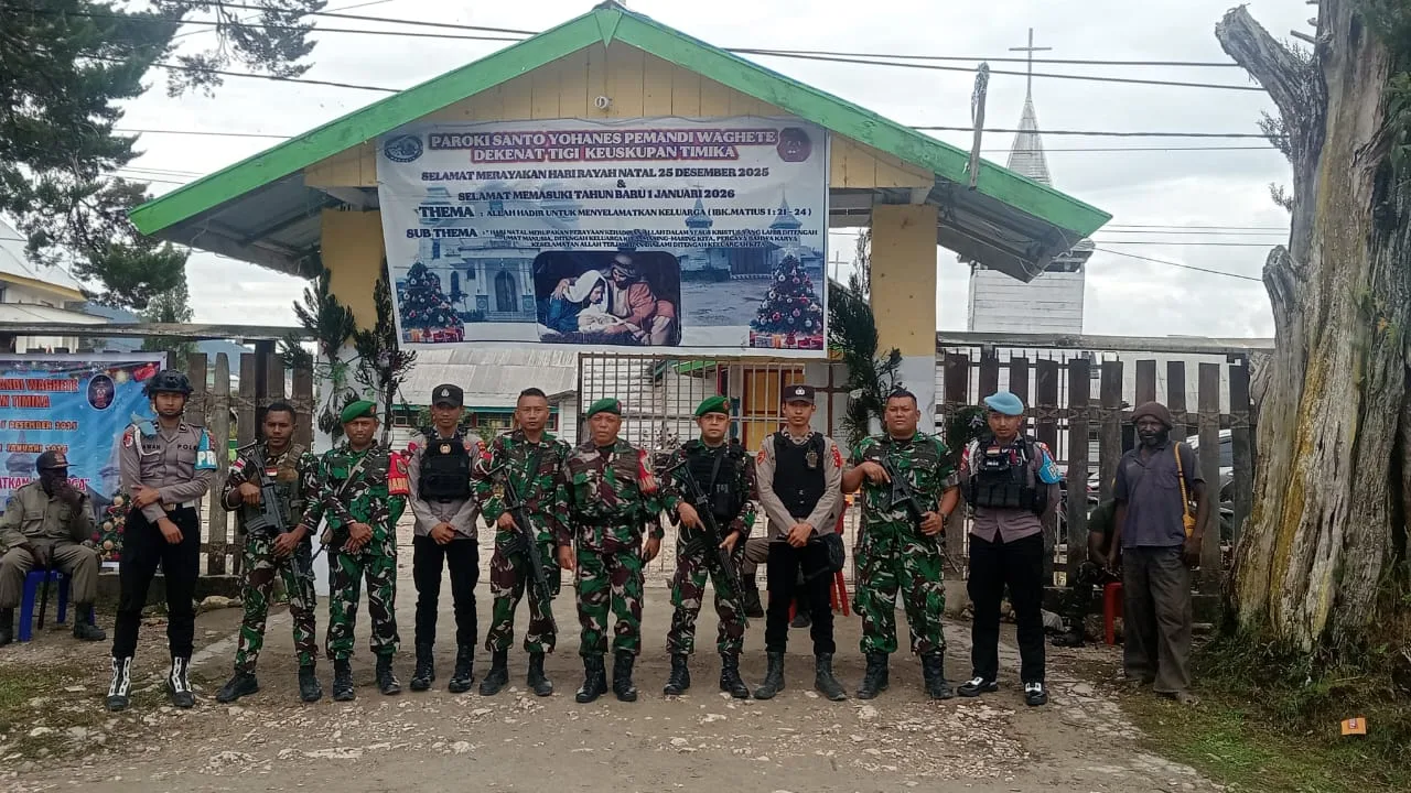 Tigi – Dalam rangka menjaga keamanan dan ketertiban selama perayaan Hari Raya Natal 25 Desember, anggota Koramil 1703-02/Tigi melaksanakan kegiatan pengamanan ibadah Natal di Gereja Paroki Santo Yohanes pemandi wagete di kampung Idege , Distrik Tigi, kabupaten Deiyai, provinsi Papua Tengah, Kamis (25/12/2025).