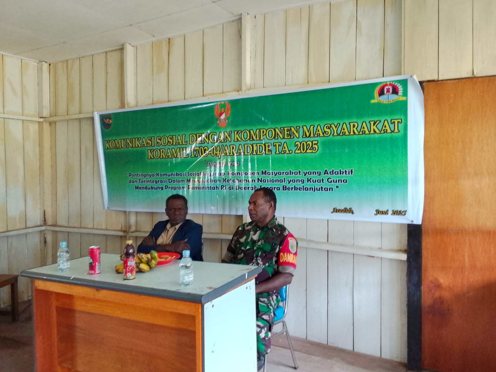 Di sela-sela itu Danramil 1703-04/Aradide (Lettu inf Alpius Gobai) dalam kesempatan itu mengatakan kepada seluruh kepala kampung, dan masyarakat yang hadir Bahwa komunikasi sosial (komsos) yang di laksanakan ini merupakan program yang harus di laksanakan sehingga membangun silahturahmi dan tali persaudaraan antar Babinsa dengan warga masyarakat , sehingga dapat menyampaikan usulan atau masukan dari masyarakat sesuai apa yang menjadi kebutuhan masyarakat di wilayah Aradide “, ungkap danramil 1703-04/Aradide