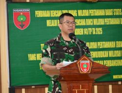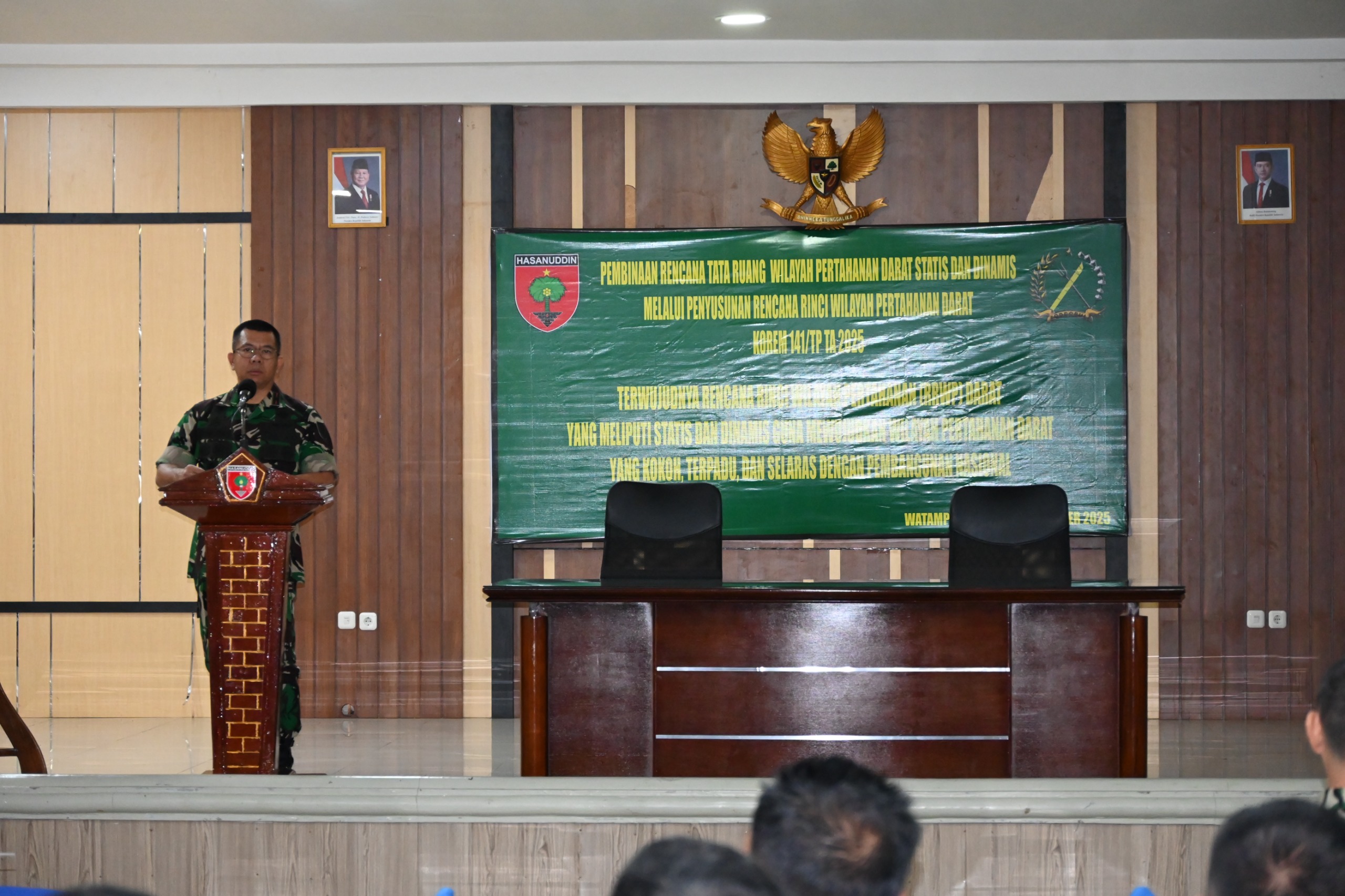 Watampone – Komandan Korem 141/Tp, Brigjen TNI Andre Clift Rumbayan, S.Sos., M.M., membuka kegiatan Pembinaan Tata Ruang Wilayah Pertahanan Darat Statis dan Dinamis Tahun 2025 di Aula Sudirman Makorem 141/Tp, (Kamis, 11/9/2025).