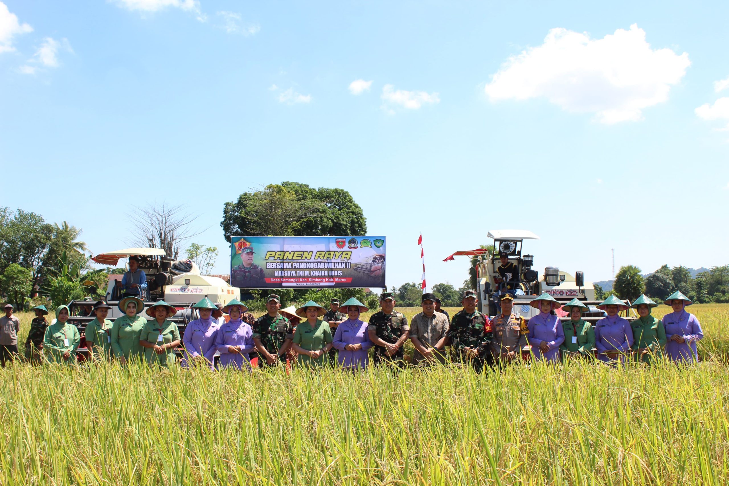 Maros — Komandan Korem 141/Tp Brigjen TNI Andre Clift Rumbayan, S.Sos., M.M., bersama Ketua Persit KCK Koorcab Rem 141 dampingi Panglima Komando Gabungan Wilayah Pertahanan (Pangkogabwilhan) II, Marsekal Madya TNI M. Khairil Lubis, melaksanakan panen raya padi di lahan seluas 99 hektare di Desa Samangki, Kecamatan Simbang, Kabupaten Maros, Sulawesi Selatan, Rabu (24/7/2025).