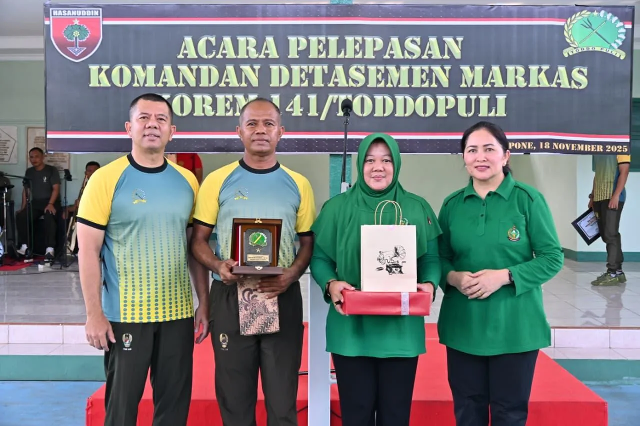 Bone – Komandan Korem 141/Tp, Brigjen TNI Andre Clift Rumbayan, S.Sos., M.M., memimpin langsung acara pelepasan Komandan Detasemen Markas (Dandenma) Korem 141/Tp, Mayor Inf Alfred Tonak, bertempat di Lapangan Tenis Makorem 141/Tp, Jl. Jend. Sudirman, Kabupaten Bone, Selasa (18/11/2025).