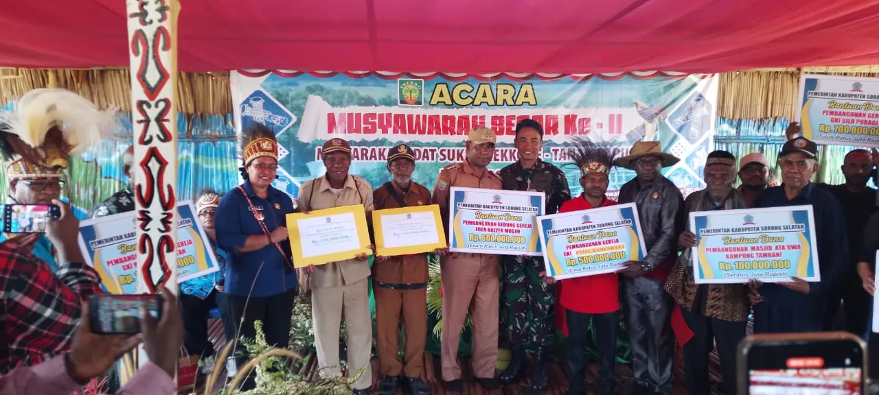 Diakhir sambutannya, Bupati Sorong Selatan Petronela Krenak, S.Sos.,M.Tr.AP., telah menyerahkan beberapa bantuan kepada masyarakat dari 5 (lima) distrik berupa uang pembinaan dan kendaraan untuk Gereja dan Masjid.