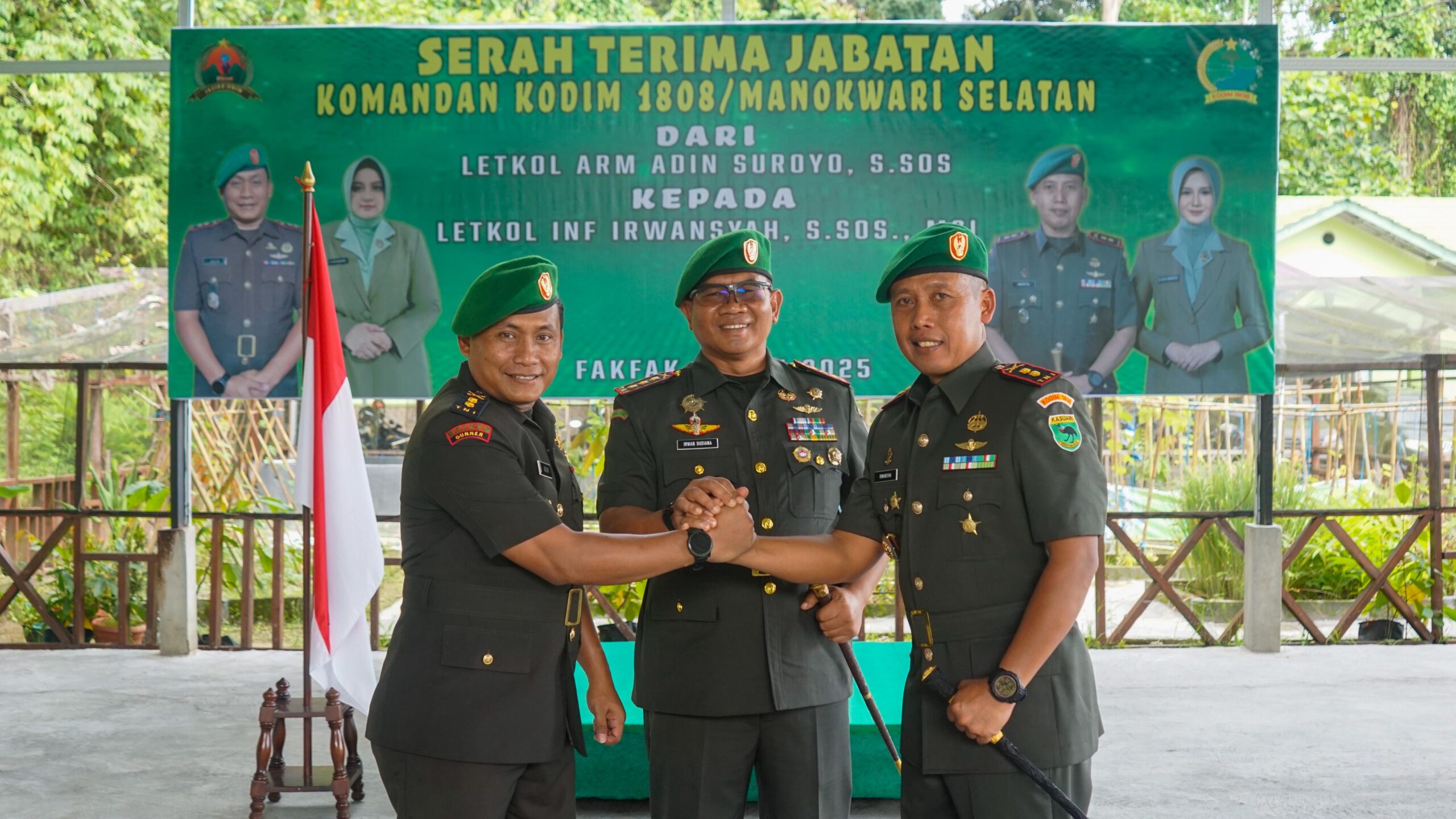 Komandan Korem 182/JO, Kolonel Inf Irwan Budiana, S.E., M.M., M.Han memimpin serah terima jabatan Komandan Kodim 1808/Manokwari Selatan dari pejabat lama, Letkol Inf Adin Suroyo, S.Sos, kepada Letkol Inf Irwansyah, S.Sos dan tradisi satuan bertempat di Garasi Serba Guna (GSG) Makorem 182/Jazira Onim, Di Kampung Kiat, Distrik Fakfak Barat, Senin, (5/5/2025)