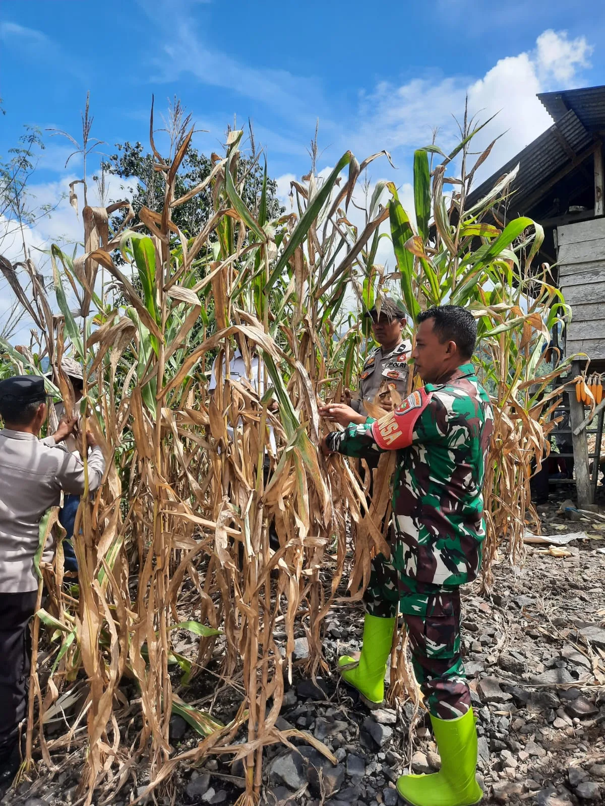 Dengan penuh semangat, Babinsa bersama warga memanen jagung di lahan pertanian milik warga binaan.