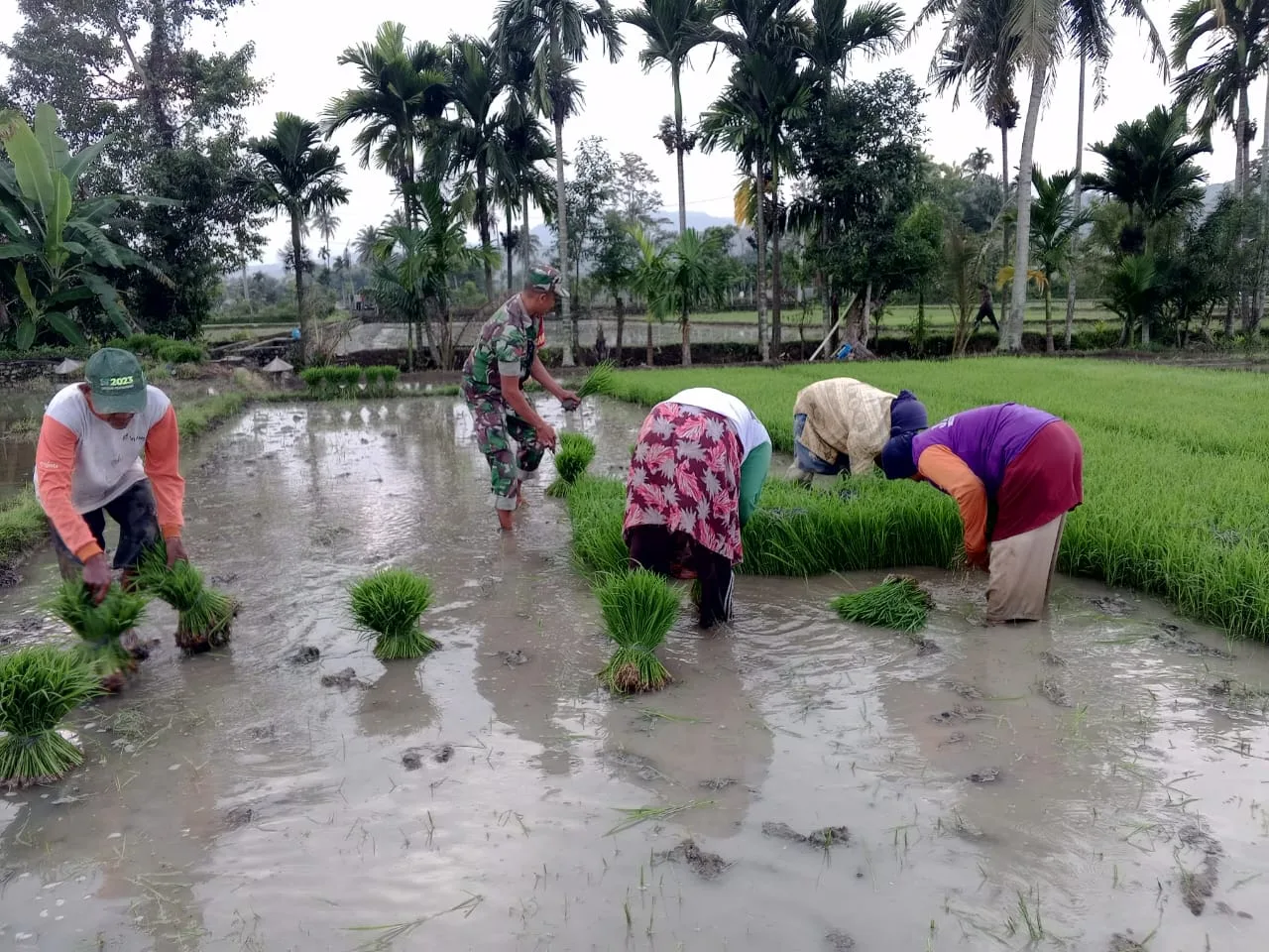 Kegiatan tersebut dilakukan sebagai bagian dari peran Babinsa dalam mendukung sektor pertanian sekaligus memperkuat kemanunggalan TNI dengan rakyat. Kopka Usman Kamil terlihat ikut serta dalam proses penanaman padi bersama petani, memberikan semangat dan motivasi agar hasil pertanian dapat meningkat.
