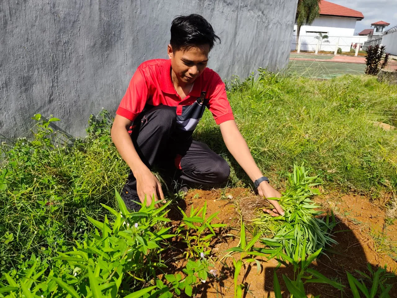 PELAIHARI, INFO_PAS — Dharma Wanita Persatuan (DWP) Rumah Tahanan Negara Kelas IIB Pelaihari melaksanakan kegiatan panen kangkung di area kebun sekitar Blok Mapenaling, Jumat (17/10).