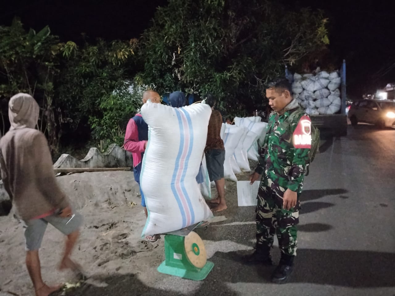 Pinrang_ Sampai tengah malam, Babinsa Koramil-01/Suppa Kodim 1404/Pinrang Serda Mustakin aktif mendampingi penyerapan gabah milik petani oleh Bulog, di Lingkungan Lappa-lappae Kelurahan Tellumpanua Kecamatan Suppa Kabupaten Pinrang, Minggu (04/05/2025).