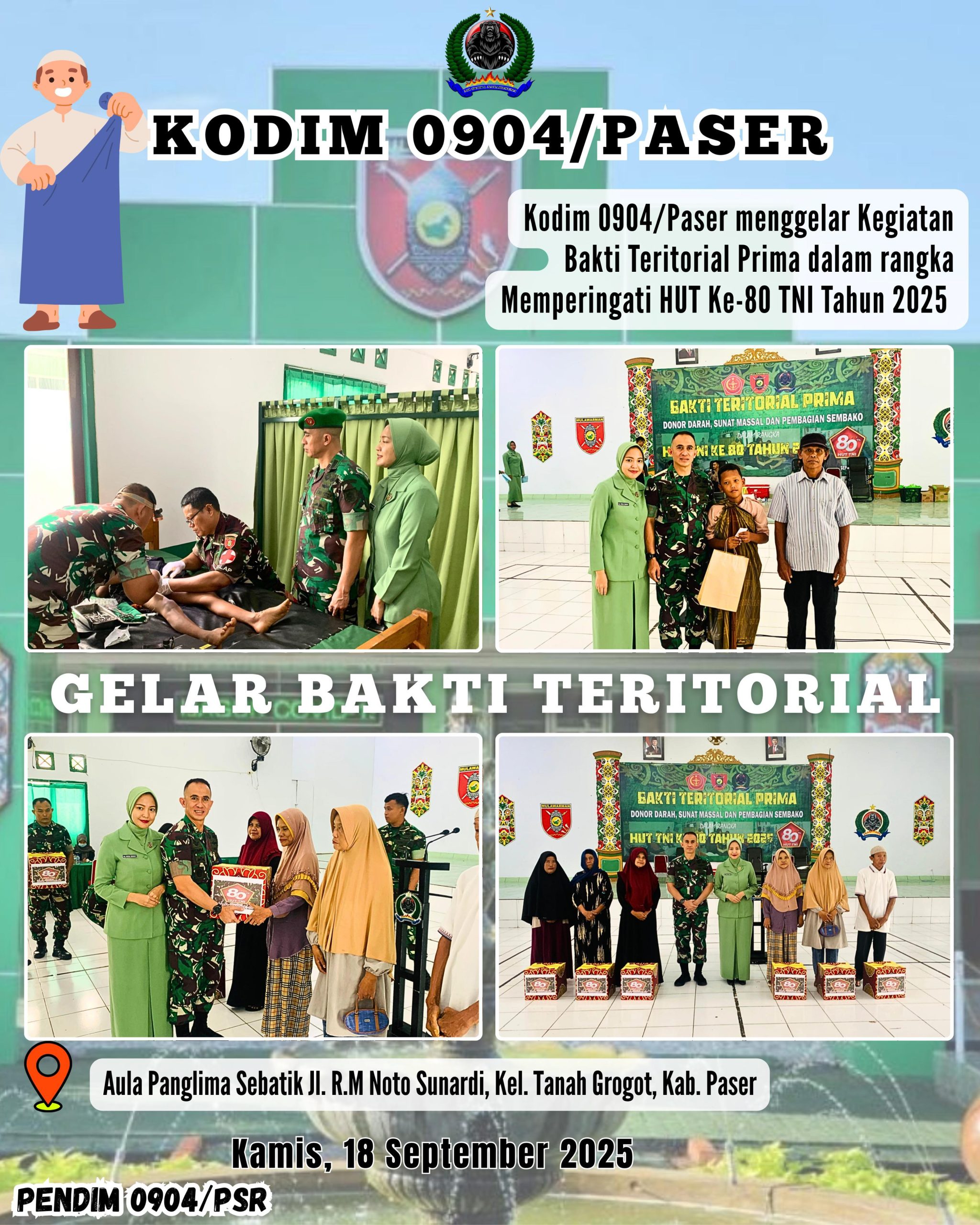 Kodim 0904/Psr, Korem 091/ASN, Kodam VI/Mlw – Kodim 0904/Paser menggelar Kegiatan Bakti Teritorial Prima dalam rangka Memperingati HUT Ke-80 TNI Tahun 2025 yang dibuka langsung oleh Komandan Kodim 0904/Paser Letkol Inf Rommy Aditya Nanda Erlambang Eretan Situlembang Darmawi, S.E., M.I.P. bertempat di Aula Panglima Sentik Kodim 0904/Paser Jl. R.M. Noto Sunardi, Kel. Tanah Grogot, Kec. Tanah Grogot, Kab. Paser, Kamis (18/9/2025).