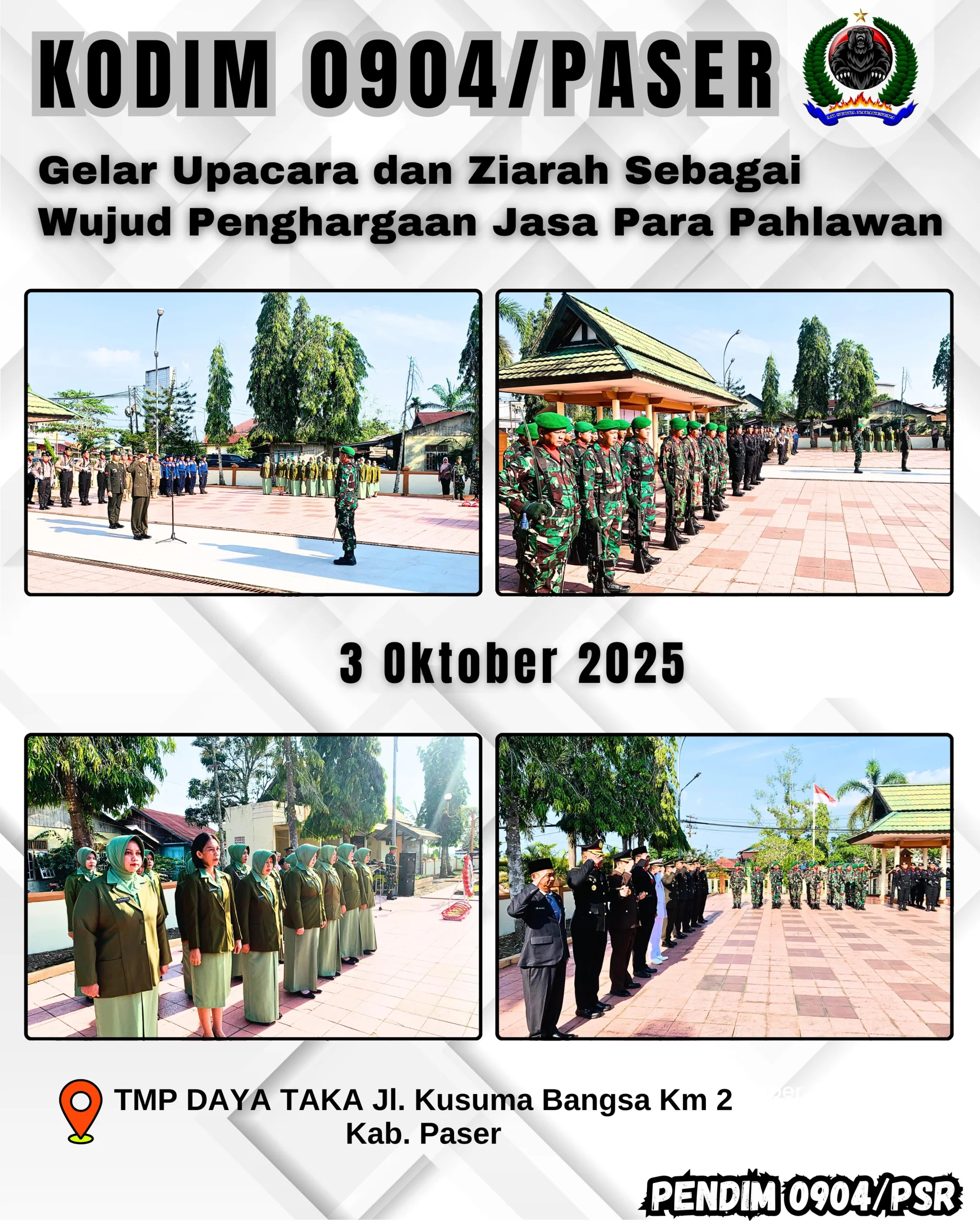 Kodim 0904/Psr, Korem 091/ASN, Kodam VI/Mlw – Pada hari Jumat tanggal 03 Oktober 2025 pukul 08.10 WITA telah dilaksanakan Upacara dan Ziarah dalam rangka Memperingati HUT TNI ke-80 tahun 2025 yang bertempat di Taman Makam Pahlawan Daya Taka Km. 01, Jalan Kesuma Bangsa, Desa Tepian Batang, Kec. Tanah Grogot, Kab. Paser.