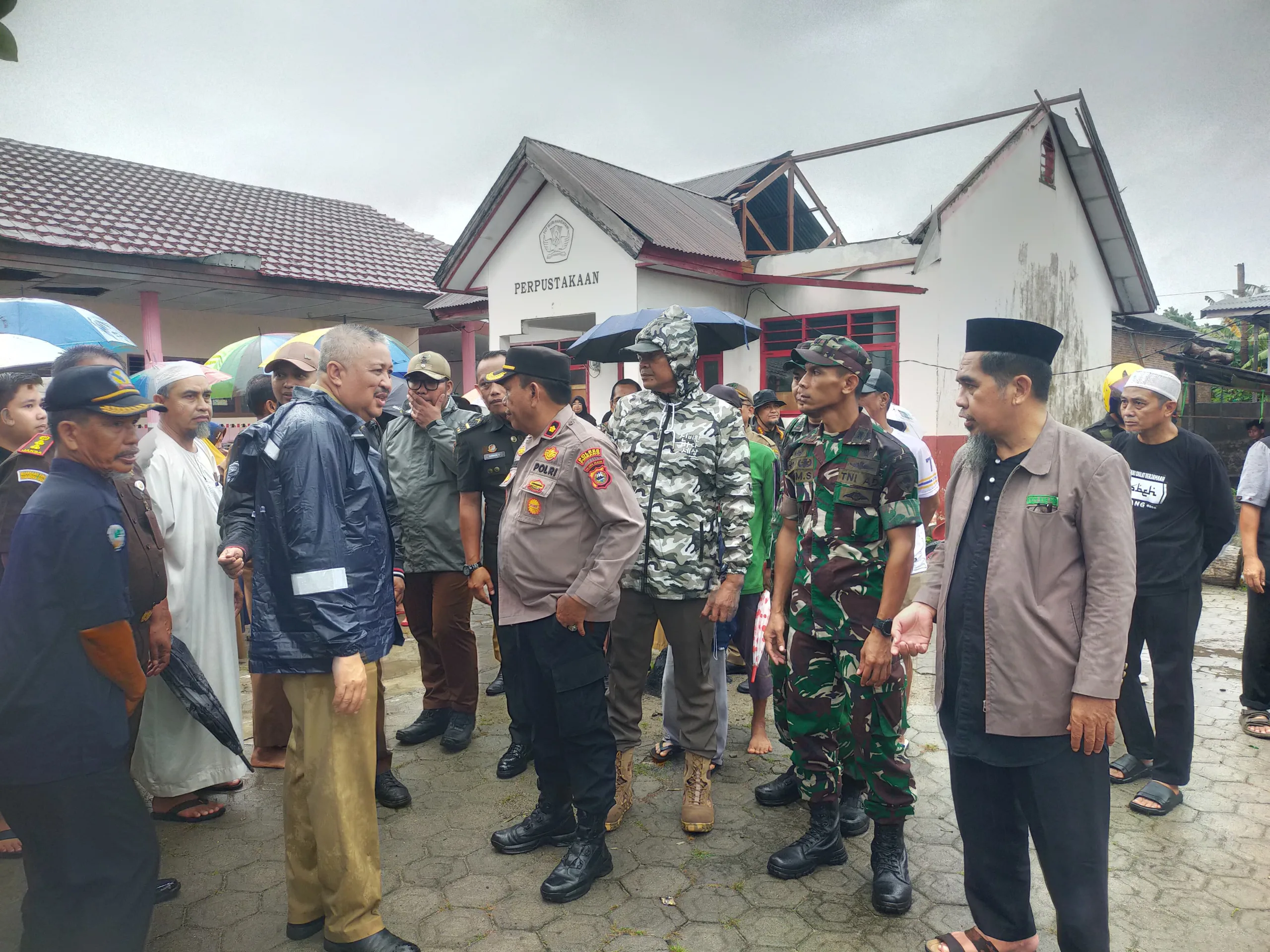 Pinrang_ Dandim 1404/Pinrang Letkol Czi Imam Subekti, S.E., M.Sc., bersama unsur Forkopimda Kabupaten Pinrang bergerak cepat mengunjungi lokasi bencana alam angin puting beliung yang melanda Lingkungan Jampue, Kelurahan Lanrisang, Kecamatan Lanrisang, Kabupaten Pinrang, Senin (15/12/2025).