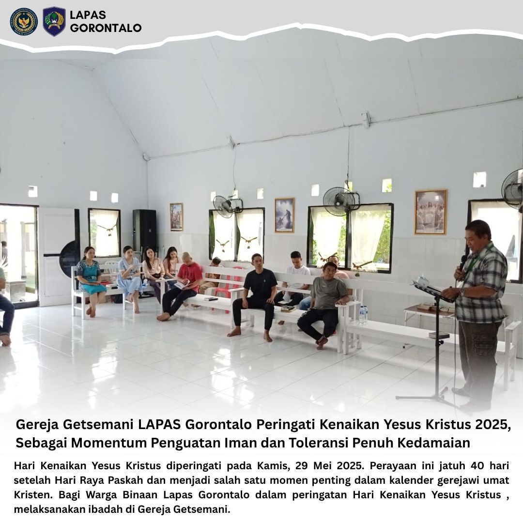 Gorontalo_Info_PAS : Hari Kenaikan Yesus Kristus diperingati pada Kamis, 29 Mei 2025. Perayaan ini jatuh 40 hari setelah Hari Raya Paskah dan menjadi salah satu momen penting dalam kalender gerejawi umat Kristen. Bagi Warga Binaan Lapas Gorontalo dalam peringatan Hari Kenaikan Yesus Kristus , melaksanakan ibadah di Gereja Getsemani.