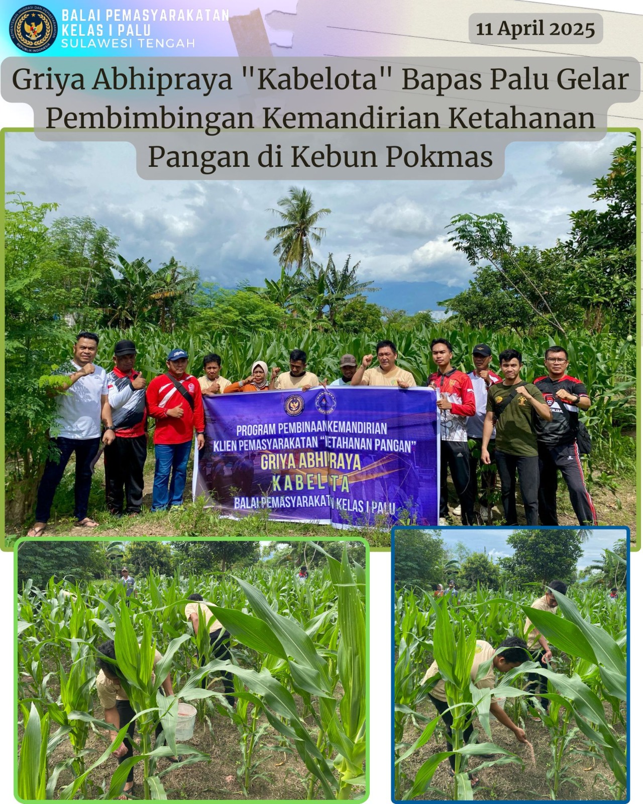 Palu, 11 April 2025 – Griya Abhipraya “Kabelota” Balai Pemasyarakatan (Bapas) Kelas I Palu kembali menunjukkan komitmennya dalam membina kemandirian Klien Pemasyarakatan. Pada Jumat, 11 April 2025, dilaksanakan program pembimbingan kemandirian dengan fokus pada ketahanan pangan di Kebun Kelompok Masyarakat (Pokmas) Bapas Palu.