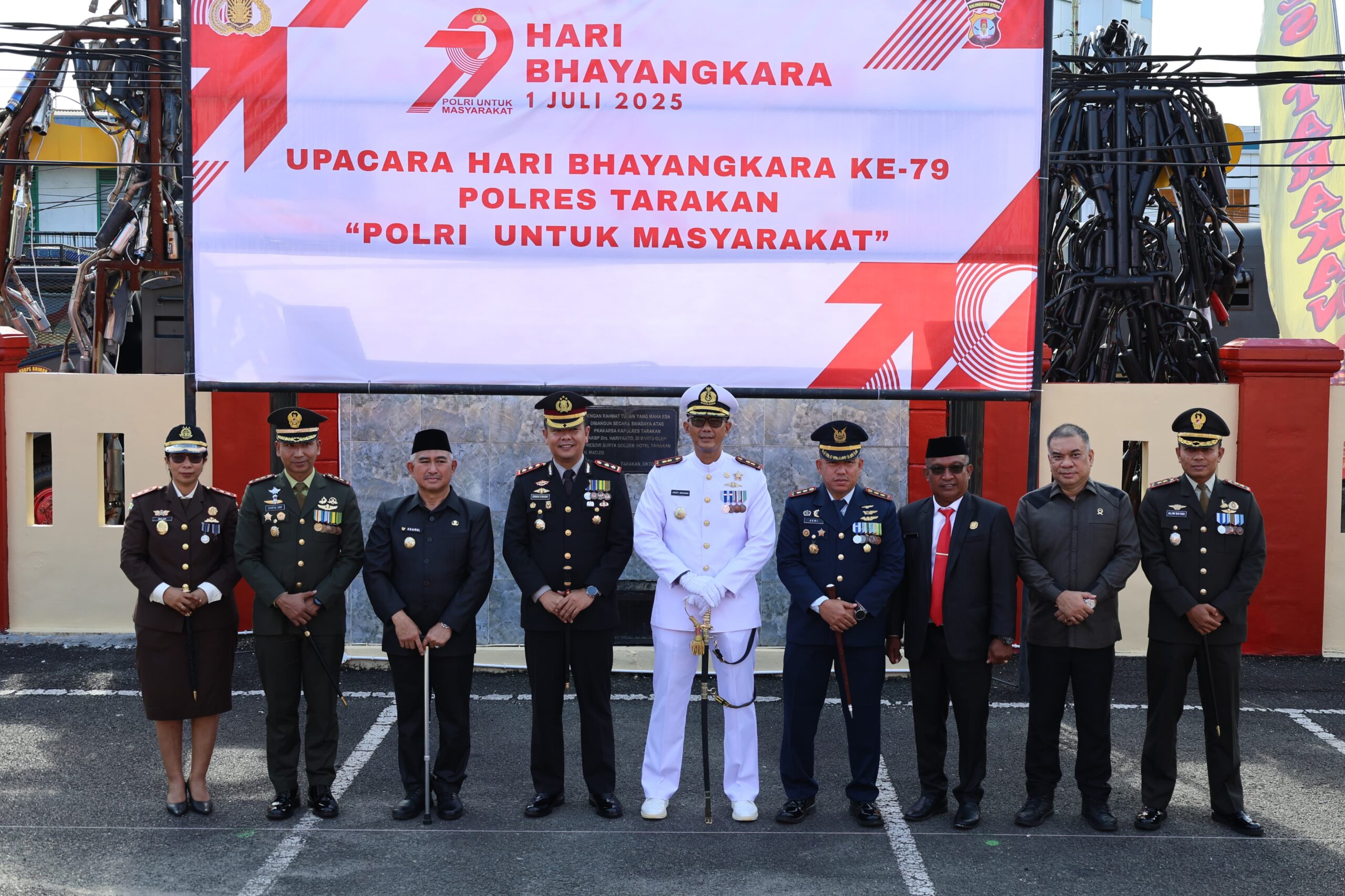Tarakan – Sejumlah unsur Forkopimda serta Dansat TNI – POLRI termasuk diantaranya, Komandan Kodim 0907/Tarakan Letkol Inf Syaiful Arif,S .Sos.,M.Han menghadiri Upacara Peringatan HUT Bhayangkara Ke 79 di Mako polres Taralan,Selasa(1/07/2025).