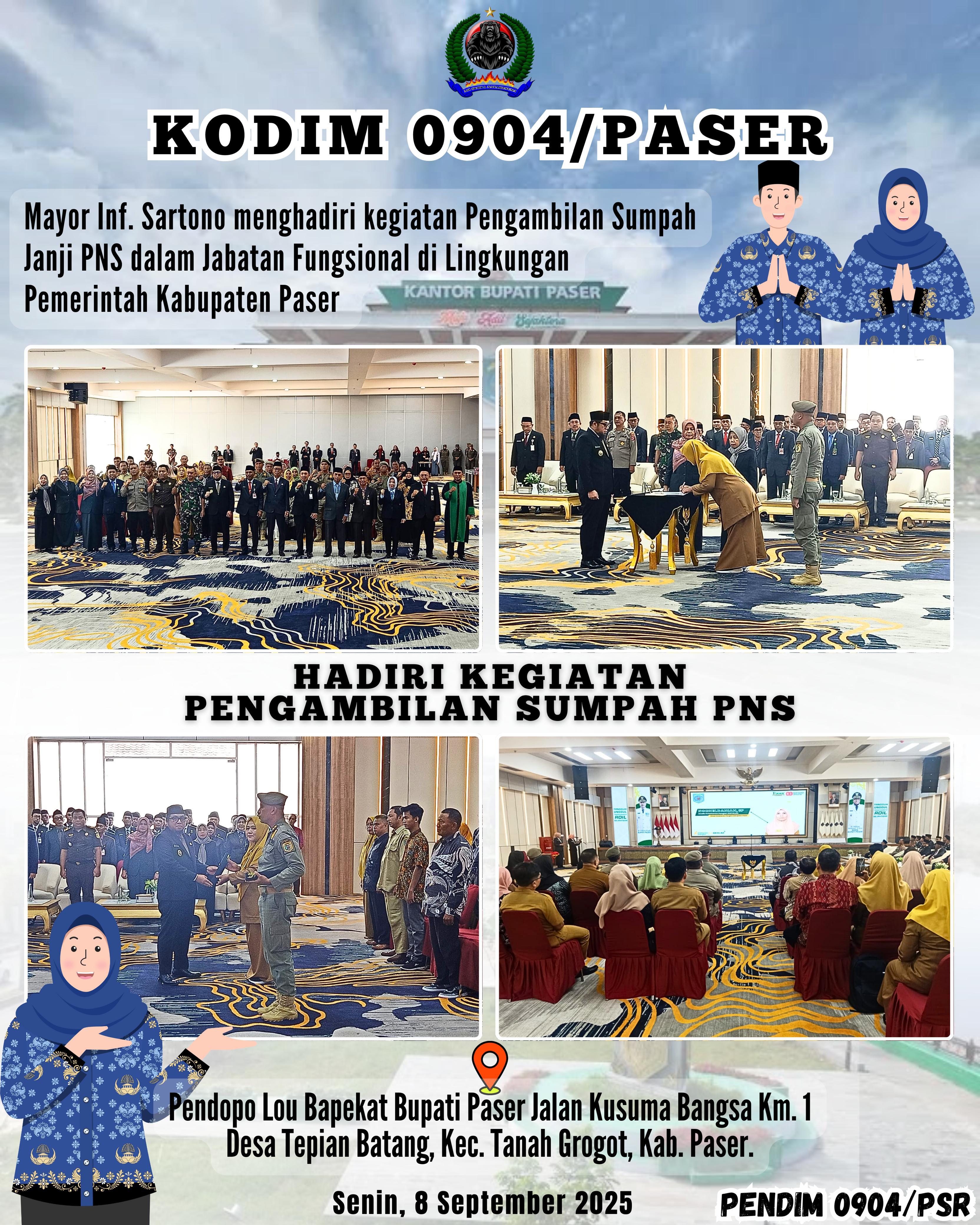Kodim 0904/Psr, Korem 091/ASN, Kodam VI/Mlw – Pada hari Senin tanggal 8 September 2025 Pukul 09.30 Kasdim 0904/Paser Mayor Inf. Sartono telah menghadiri kegiatan Pengambilan Sumpah/Janji PNS dalam Jabatan Fungsional di Lingkungan Pemerintah Kabupaten Paser bertempat di Pendopo Lou Bapekat Bupati Paser Jalan Kusuma Bangsa Km. 1 Desa Tepian Batang, Kec. Tanah Grogot, Kab. Paser.