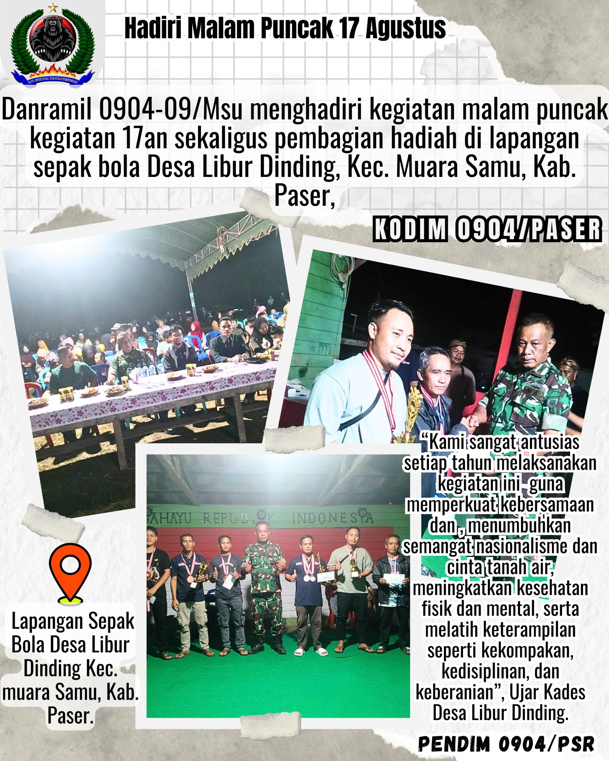 Kodim 0904/Paser, Korem 091/ASN, Kodam VI/Mlw – Danramil 0904-09/Msu menghadiri kegiatan malam puncak kegiatan 17an sekaligus pembagian hadiah di lapangan sepak bola Desa Libur Dinding, Kec. Muara Samu, Kab. Paser, Kamis (28/8/2025).