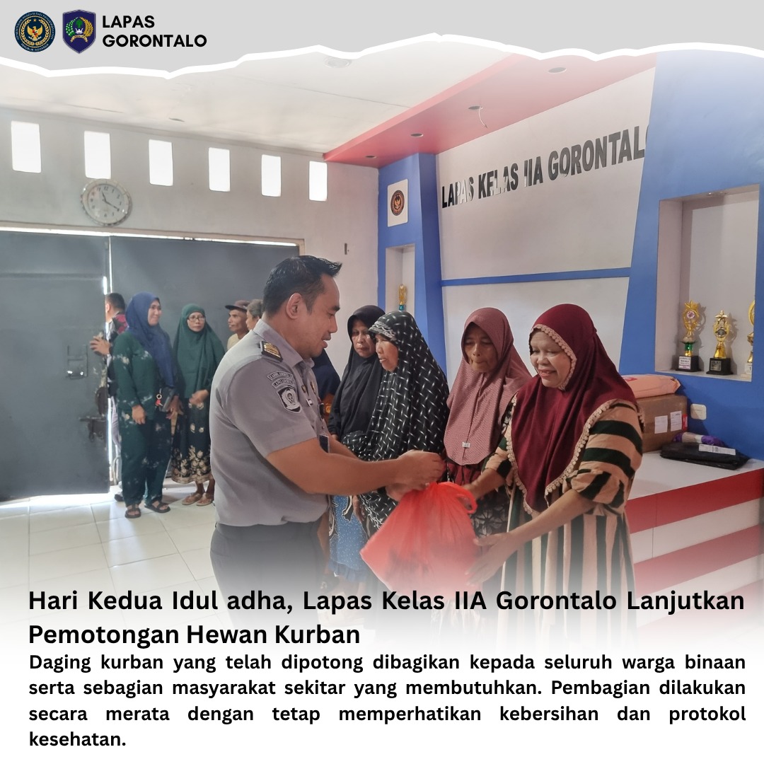 Dengan pelaksanaan kurban hari kedua ini, diharapkan semangat pengorbanan dan kebersamaan dapat terus terjaga di lingkungan Lapas Kelas IIA Gorontalo, menjadi pengingat bahwa setiap individu memiliki kesempatan untuk berubah dan berbagi kebaikan.